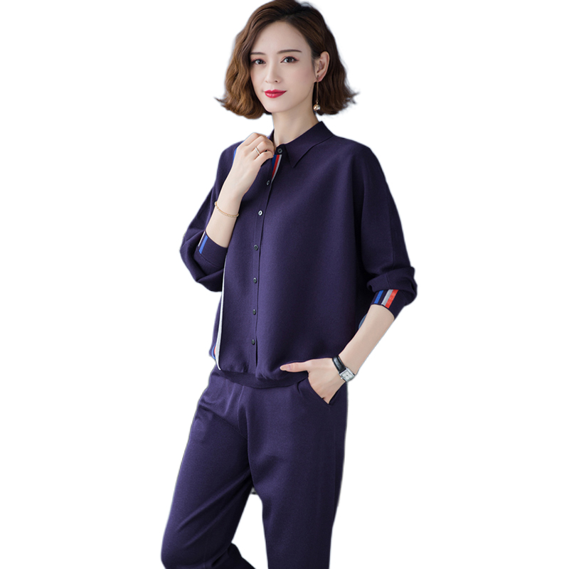 Shirt Collar Ice Silk Knit Sports Suit Ladies Spring and Autumn Loose Dolman Sleeves Foreign Style Mom Fashion Two-piece Set