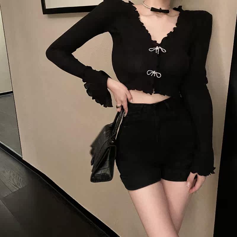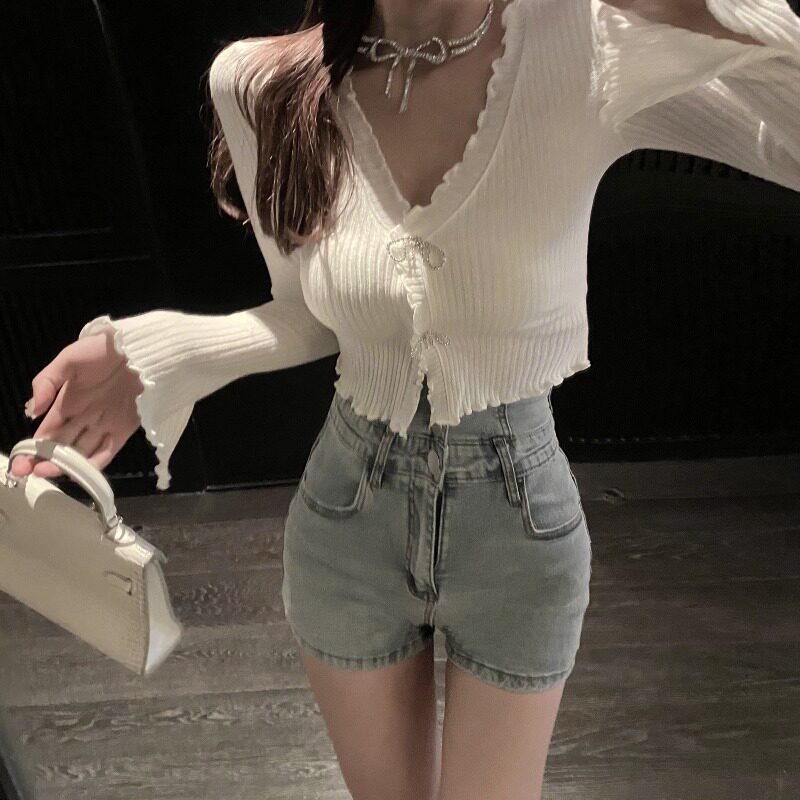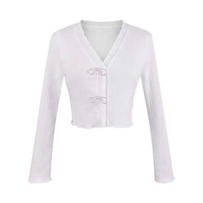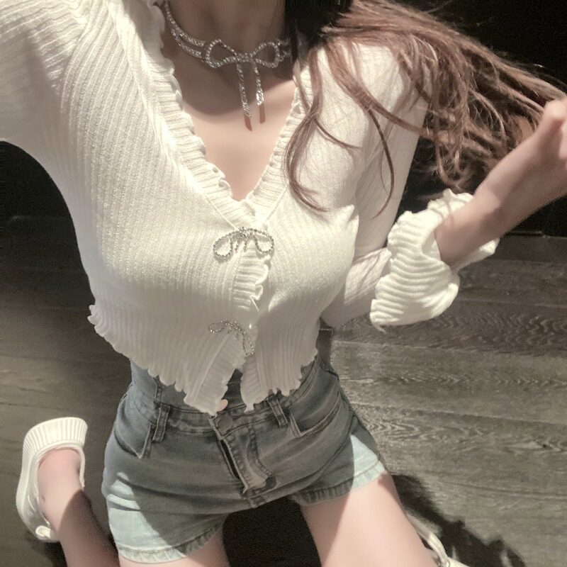 Vanya white blouse sweater autumn and winter mentsuccious V-collar butterfly knitted and wear a long sleeve with a topper