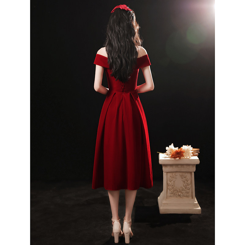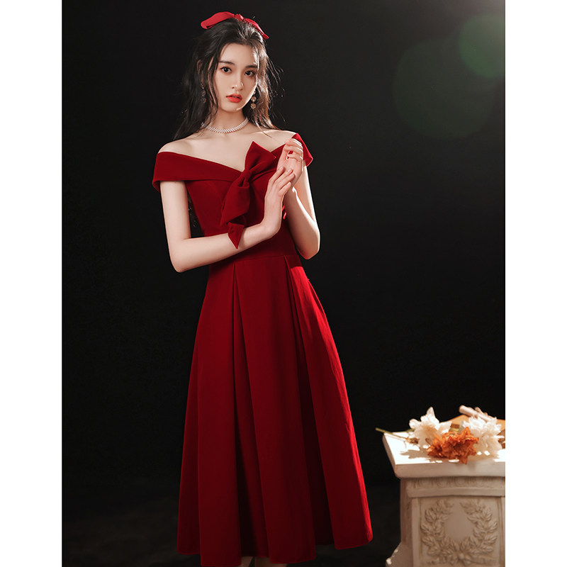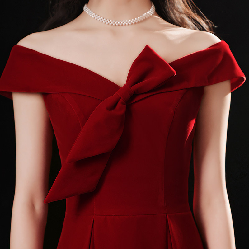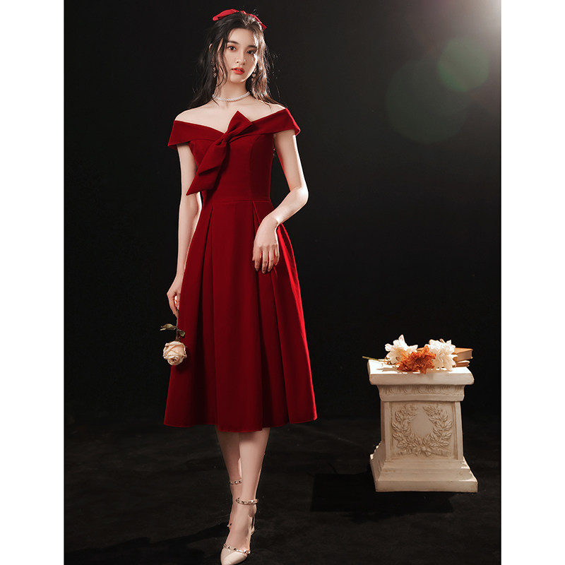 One-shoulder toast dress summer bride wine red bow engagement dress small dress skirt female summer small