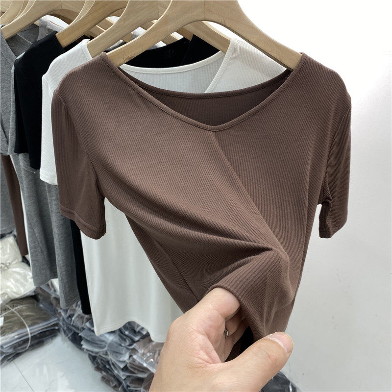 European goods wild thread short-sleeved T-shirt women's 2021 summer new low round neck exposed clavicle inner tie base shirt thin top