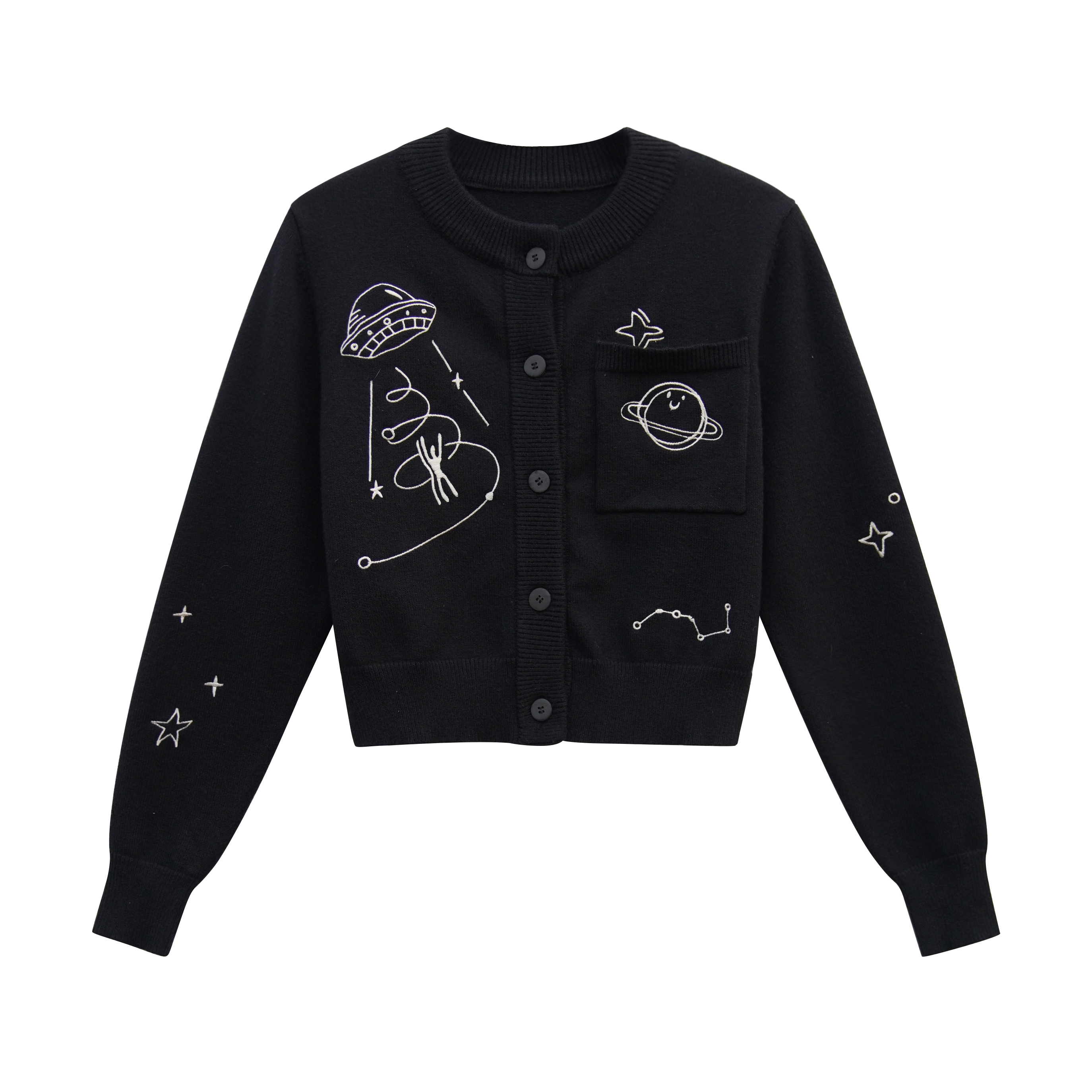 Ouyang Xi creative universe embroidered sweater jacket female 2021 new small knitted cardigan female lazy wind