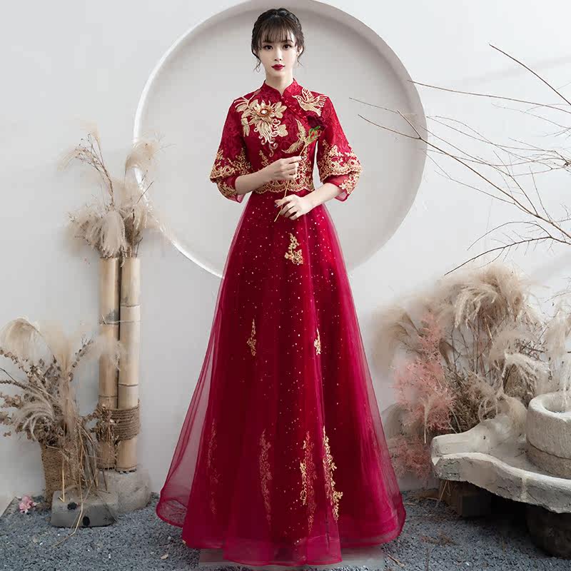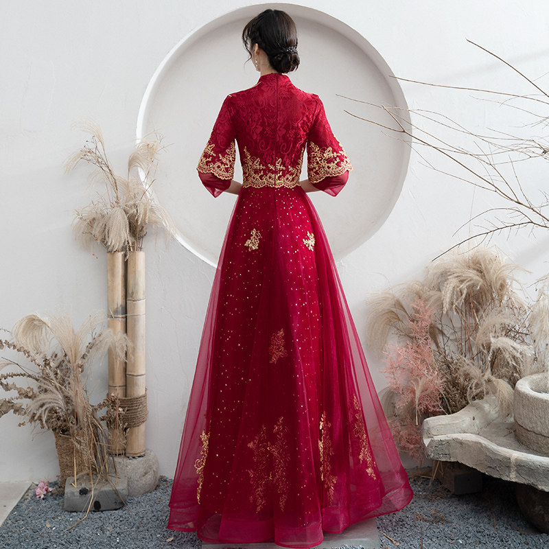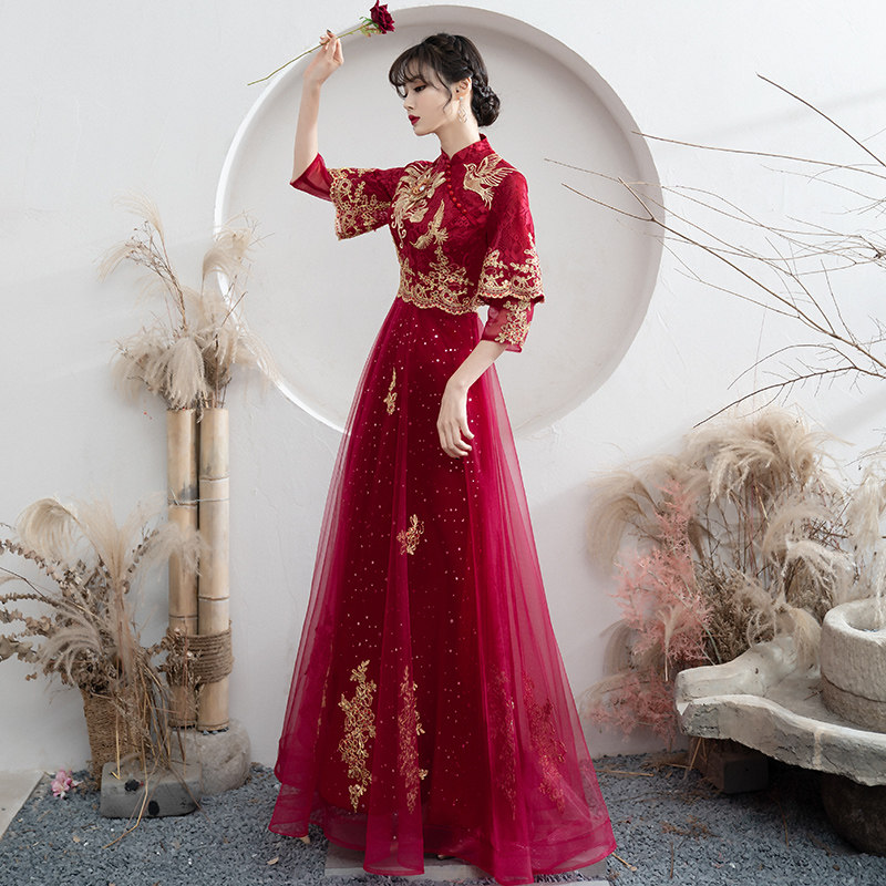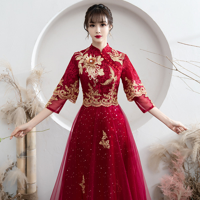 Chinese toast to the bride 2022 new red summer long sleeve qipao show and wedding gown female summer style