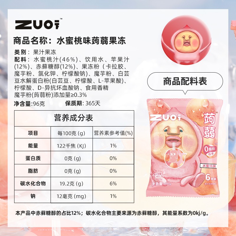 Peach juice (46%) drinking water apple juice (12%) erythritol (12%) jelly powder (carrageenan konjac powder potassium chloride sodium citrate) konjac powder white kidney bean