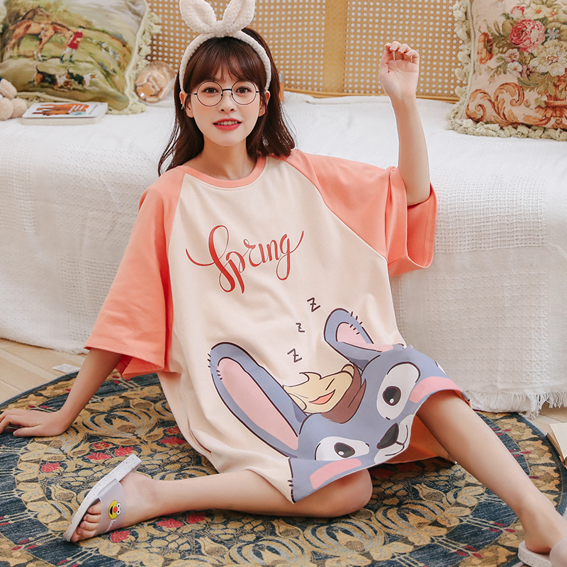 Nightgown women summer cotton cute spring and autumn thin Korean version of the student short-sleeved homewear loose plus size maternity pajamas