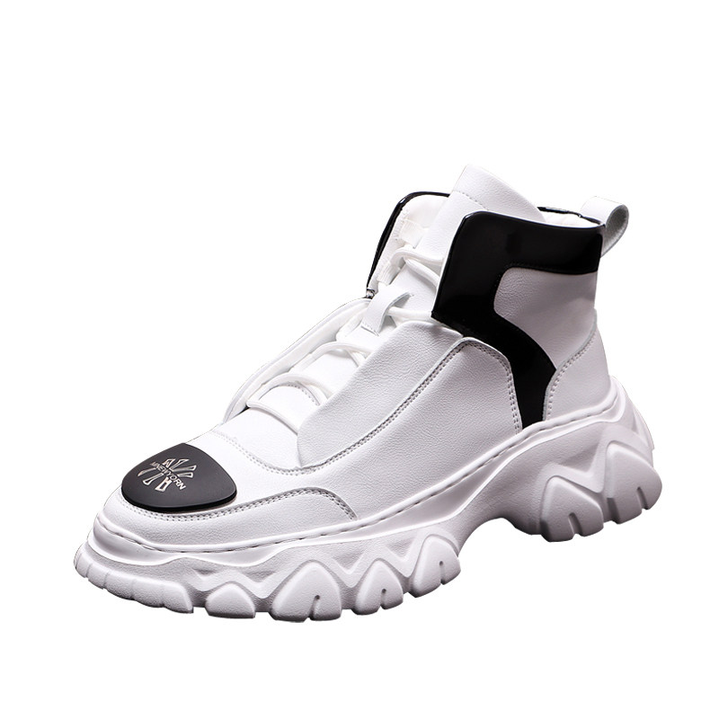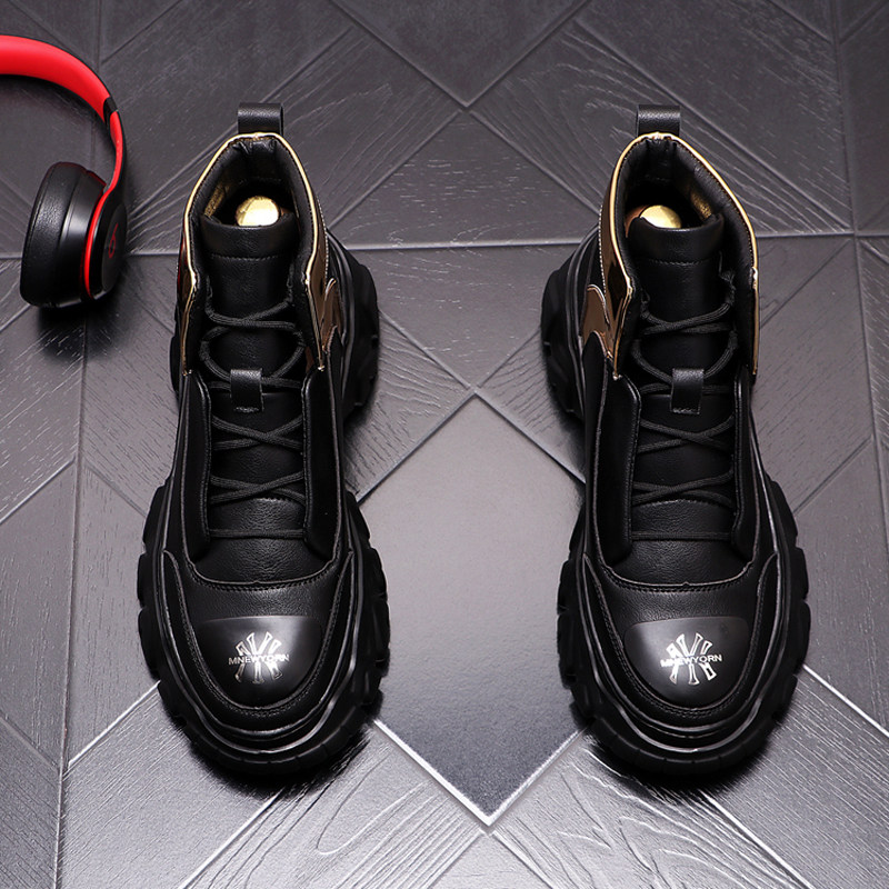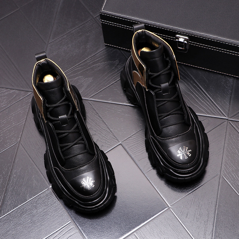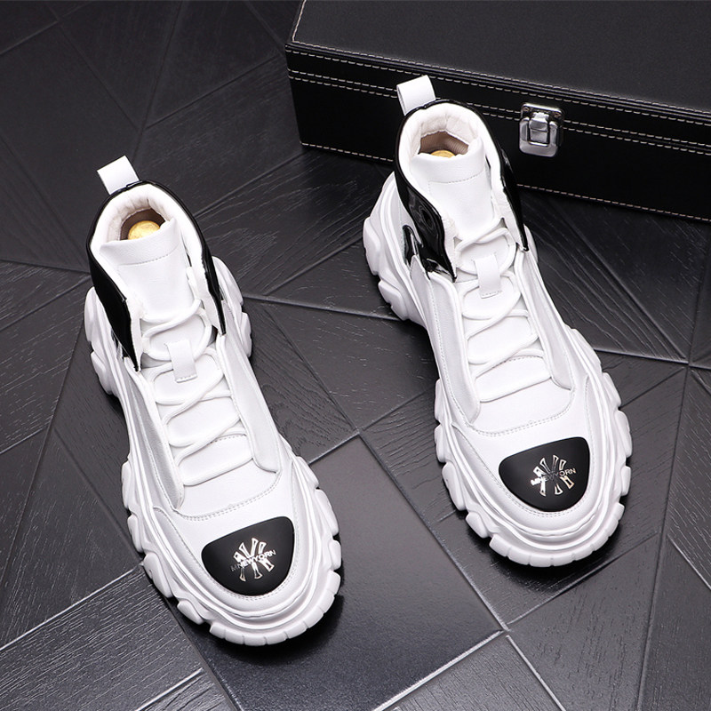 European station white daddy shoes men's personality printing increased pure leather cowboy boots British leather thick-soled high-top shoes men
