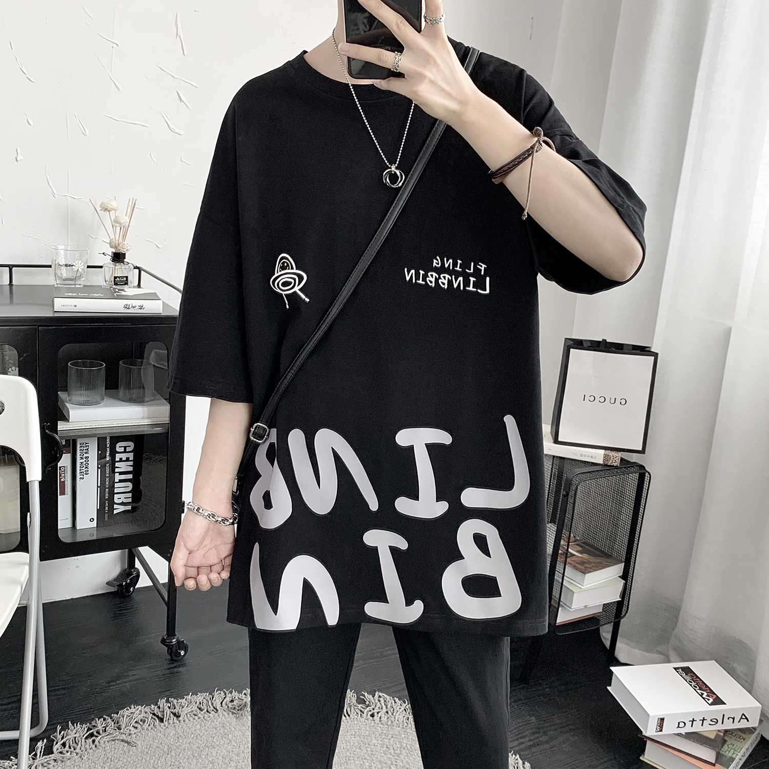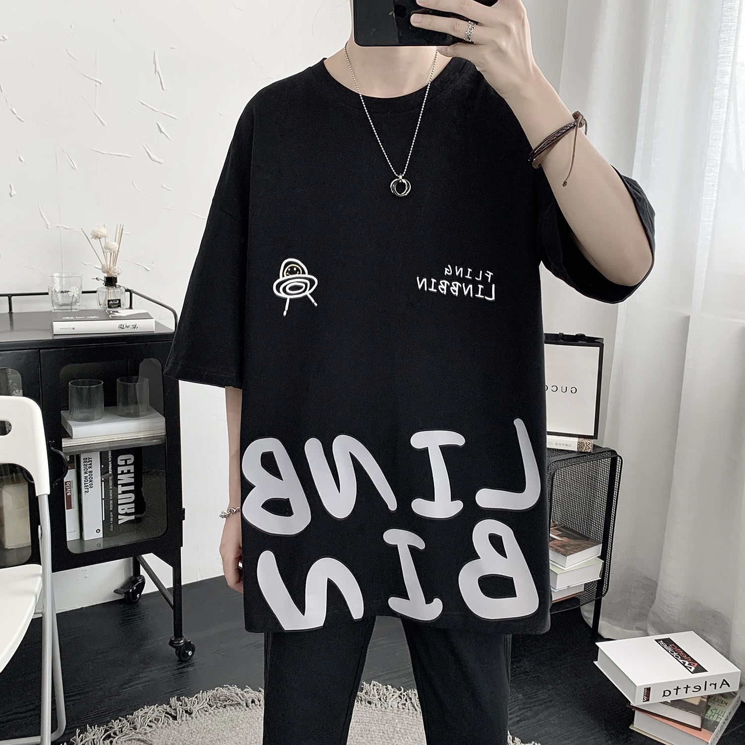 2021 Summer short sleeves T-shirt male tide Billboard ins overfire port Wind round collar loose 100 lap dresses male trend blouses