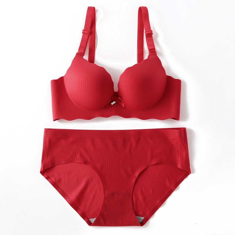 This year's underwear women's thick gathering small breasts, non-marking wedding bride bra set Red no steel ring