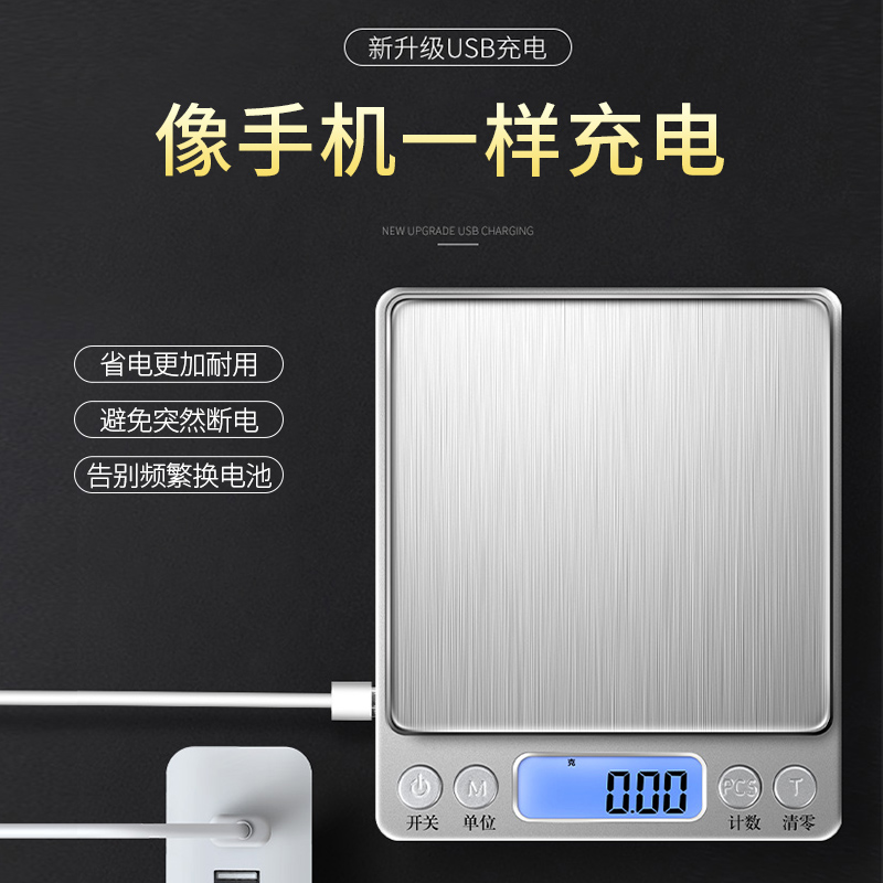 (Lithium battery fast charge) Chinese 3kg 0.1g double tray + scale bowl + weight + measuring cup + waterproof sticker