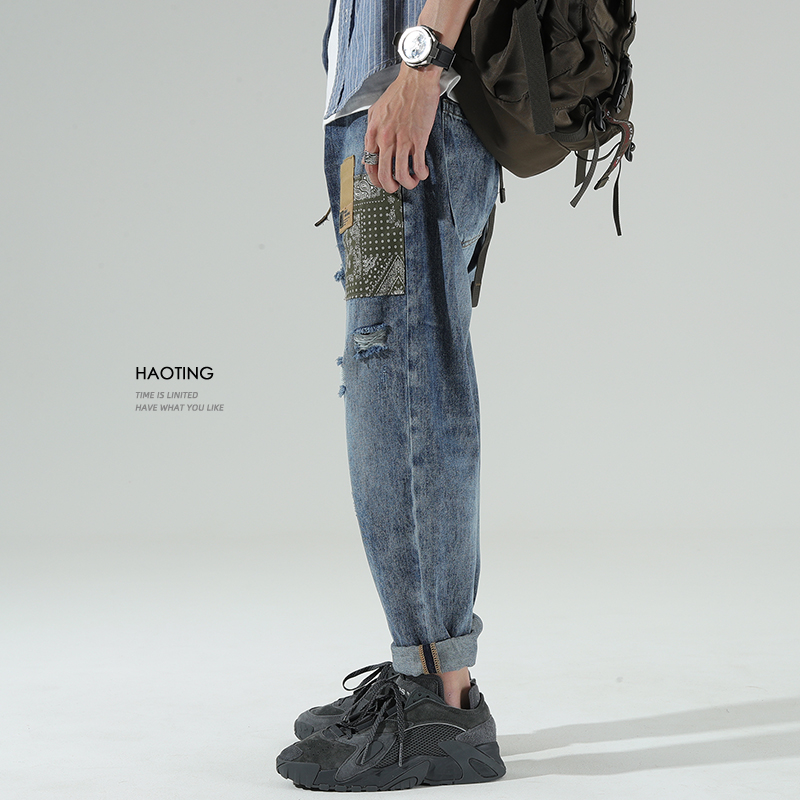 Summer Break Hole Jeans Male Loose Straight Drum Cloth Stickup Beggar Pants Tide Cards For Minor Feet Casual 90% Pants Thin
