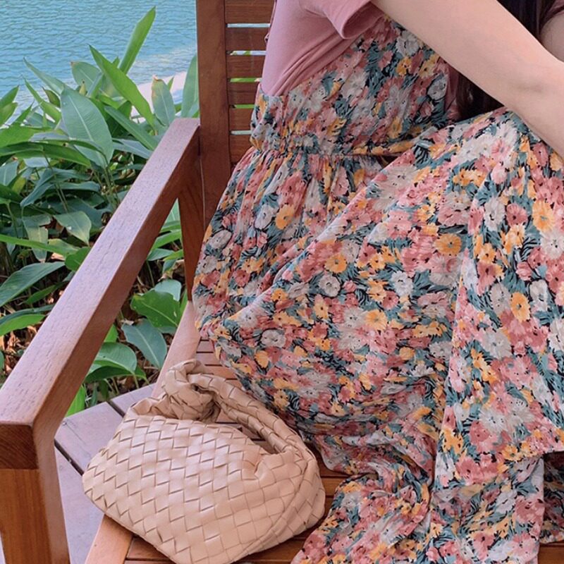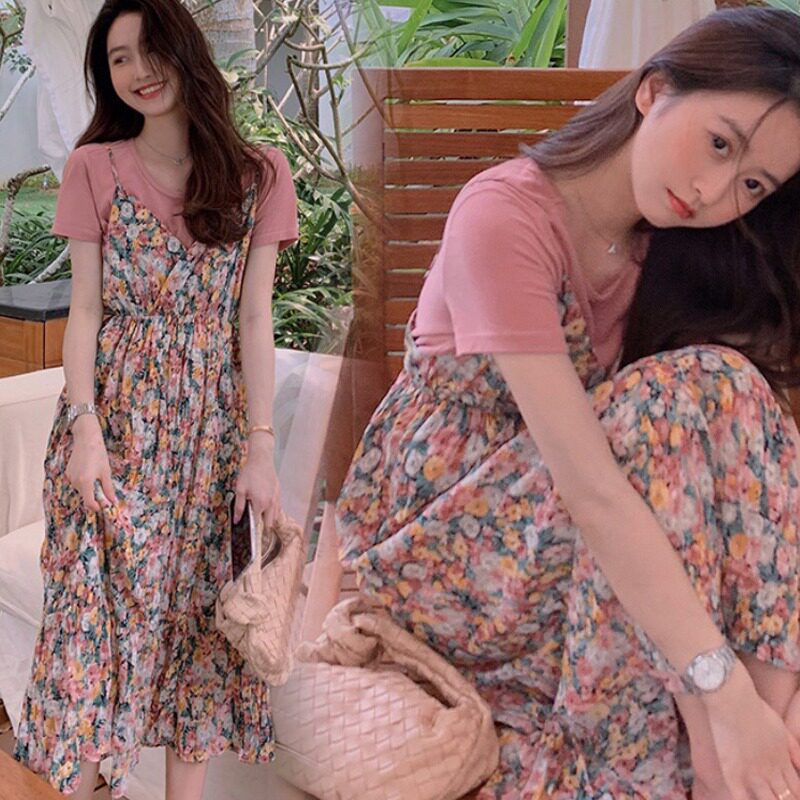 Pregnant women's dresses wear trendy hot mom net red foreign style floral skirts small fragrant wind cover belly summer suits small