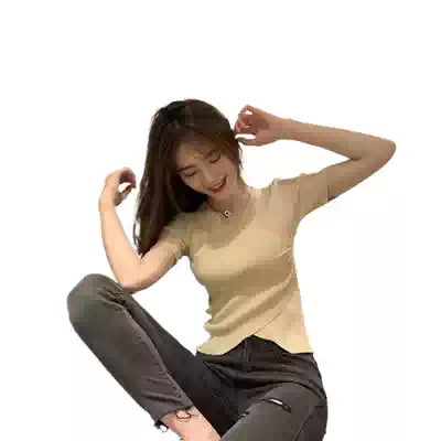 Ice silk knit sweater women's 2021 summer new short sleeve base shirt slim vneck half sleeve t-shirt high waist short top