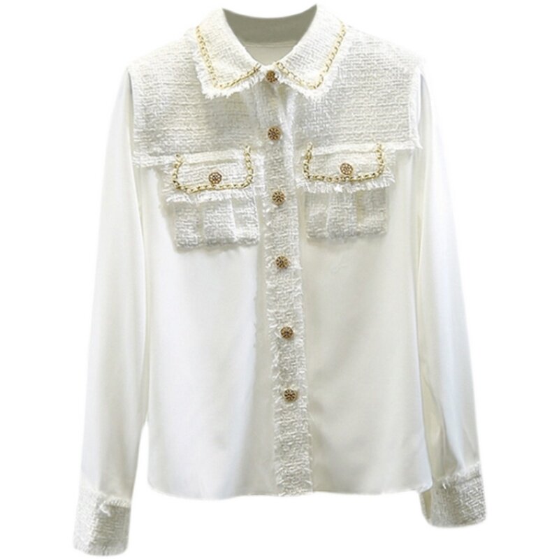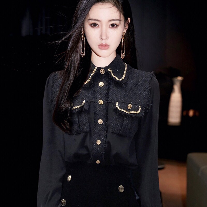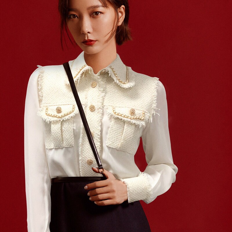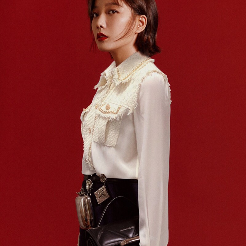 French MAJE Zhao Liying stars the same double-pocket genuine silk splicing knitted coarse flower shirt blouses female
