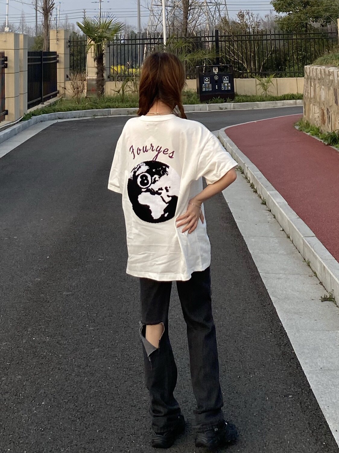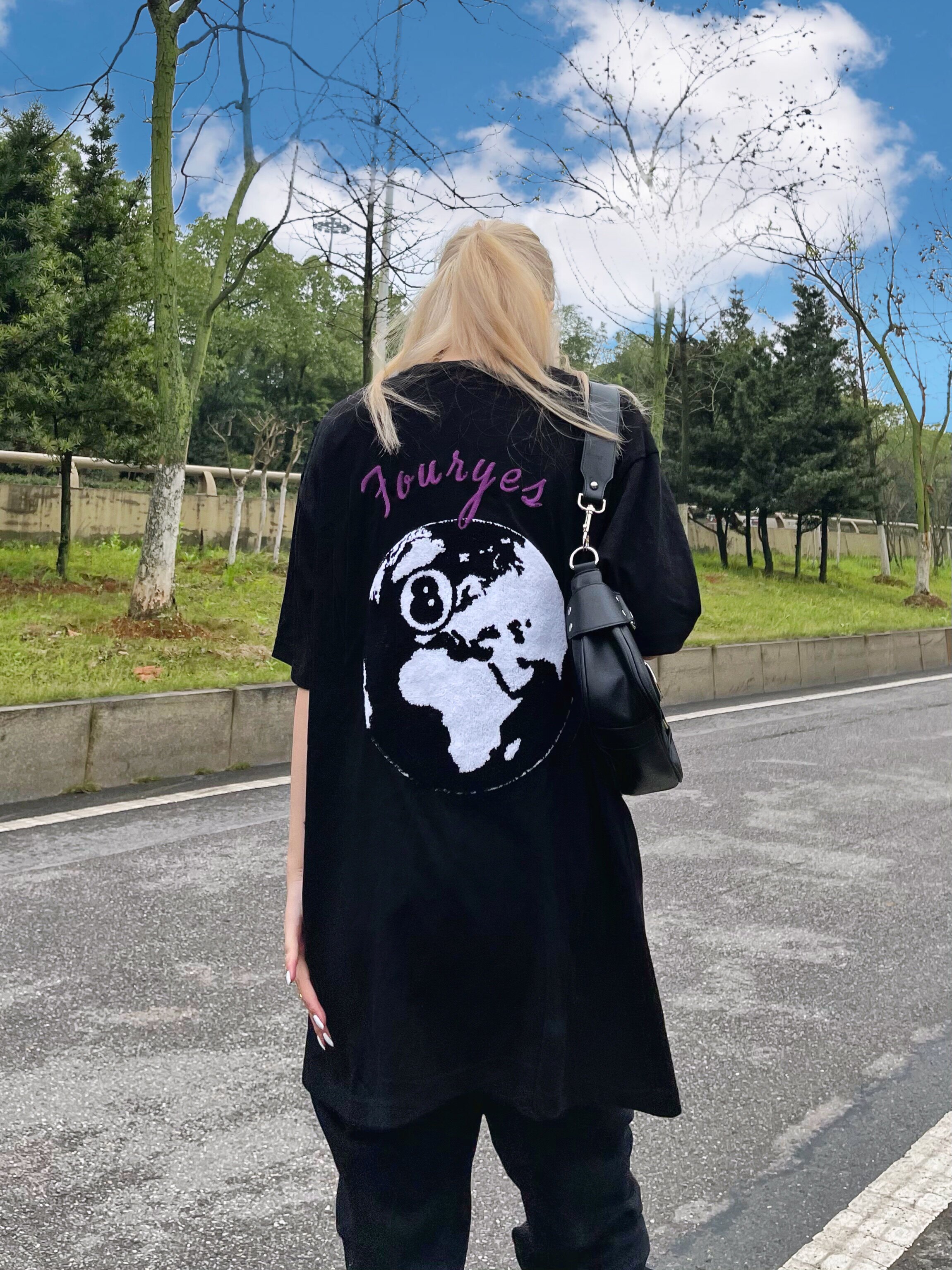 FORUYES(4UYES) Retro black eight American street embroidery flocking tide loose men's and women's round neck T-shirt short sleeve