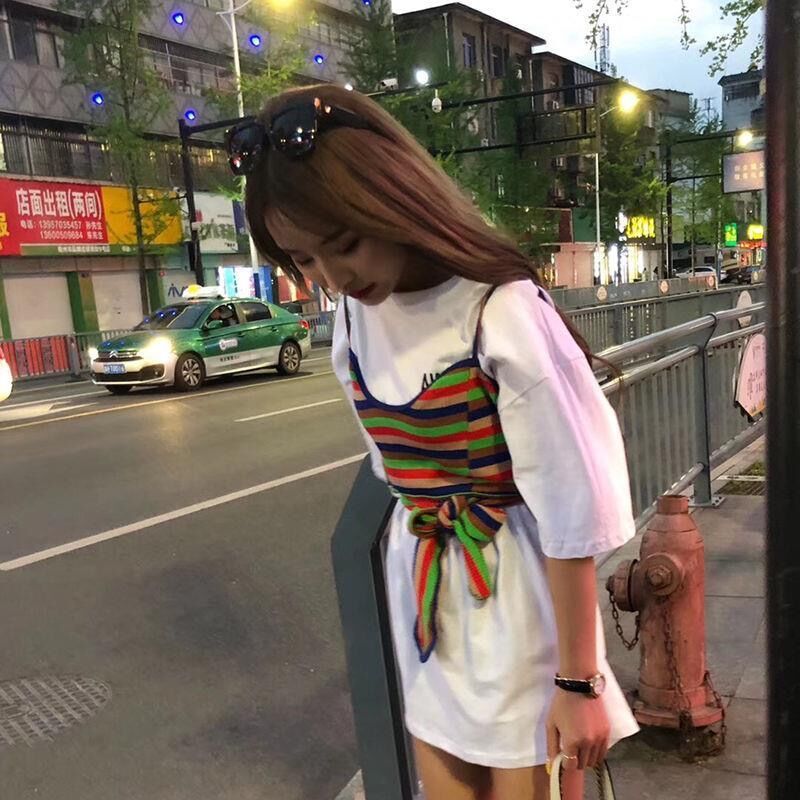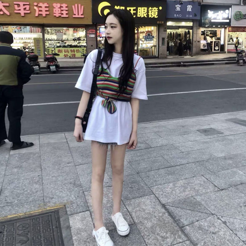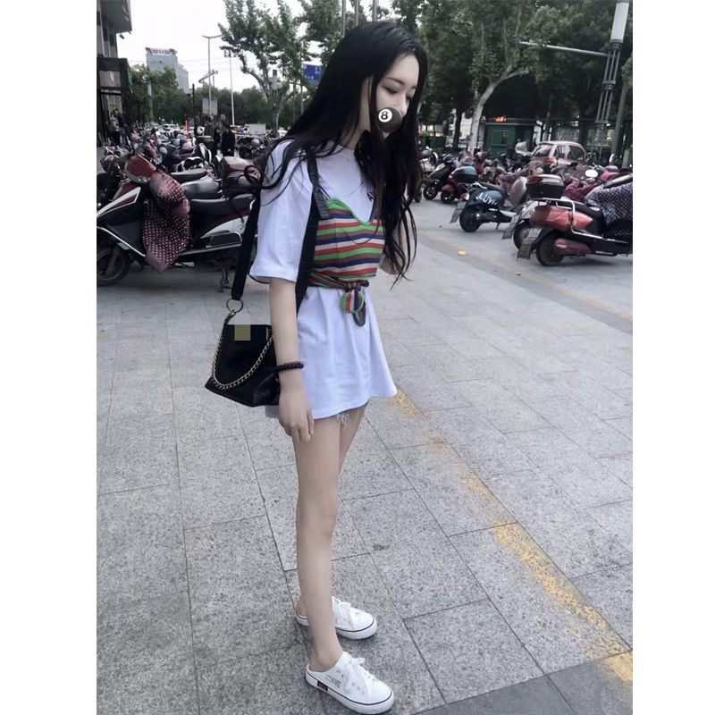 Women's dress suit Summer mid-length T-shirt short sleeve Rainbow harness vest blouses two sets of damp