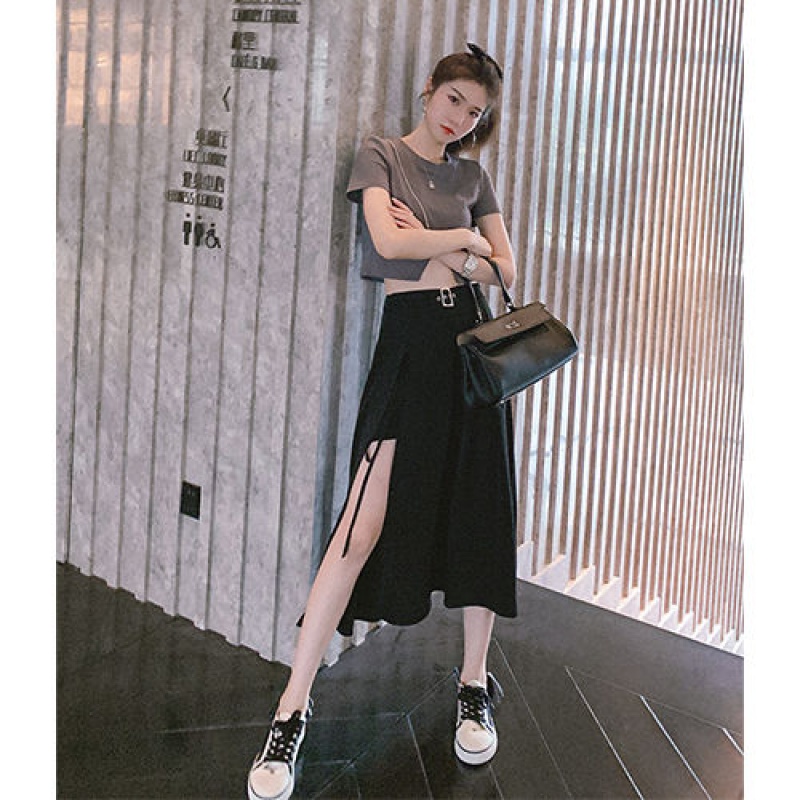 Suit woman Xia 2021 new Korean version loose T-shirt blouse open fork medium long version half body dress fashion Two sets