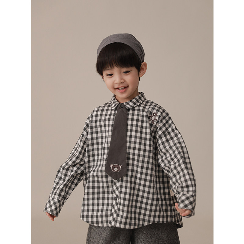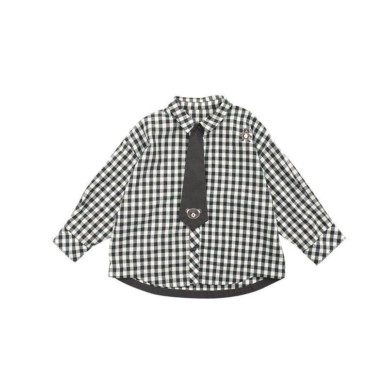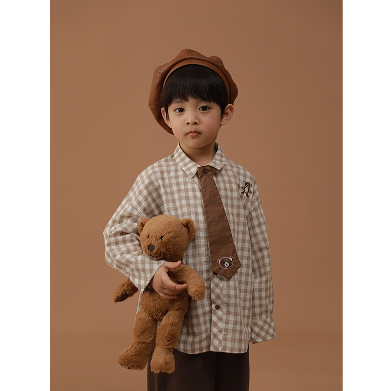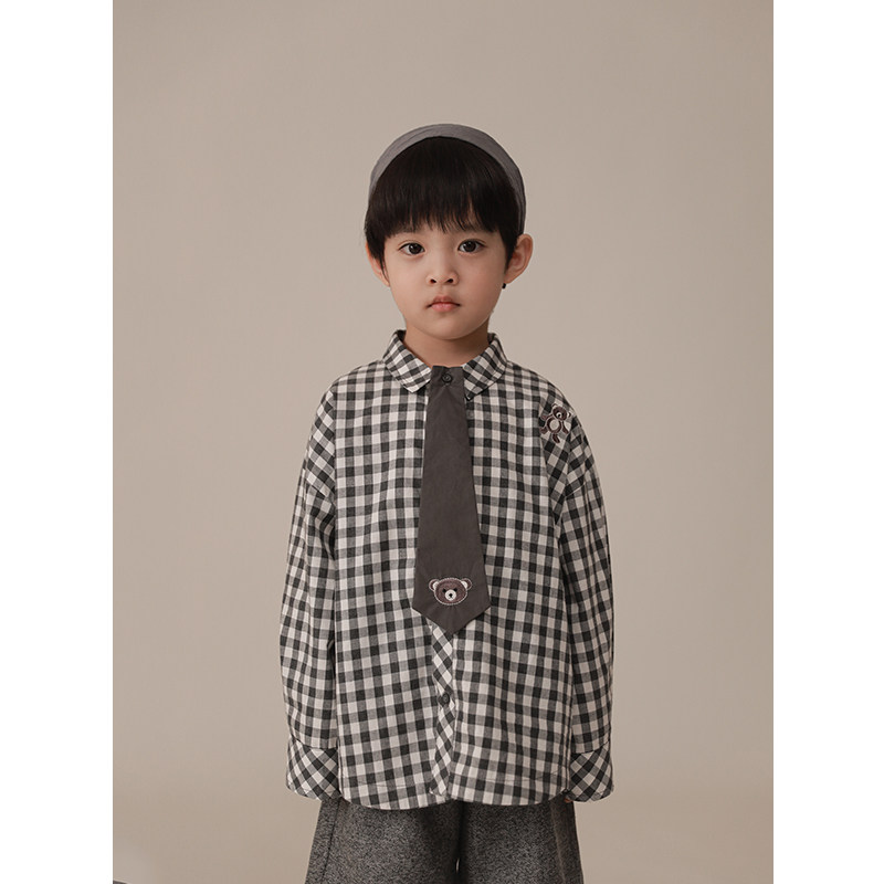 Young Yo-yo boy detachable button Tie Shirt Plaid Embroidered Little Bear Shirt Jacket Children's Spring Mounted Tide Coups