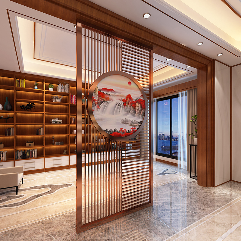 New Chinese style stainless steel screen partition villa living room light luxury yellow titanium alloy metal entrance decoration lattice customization