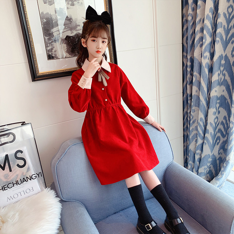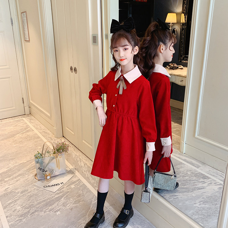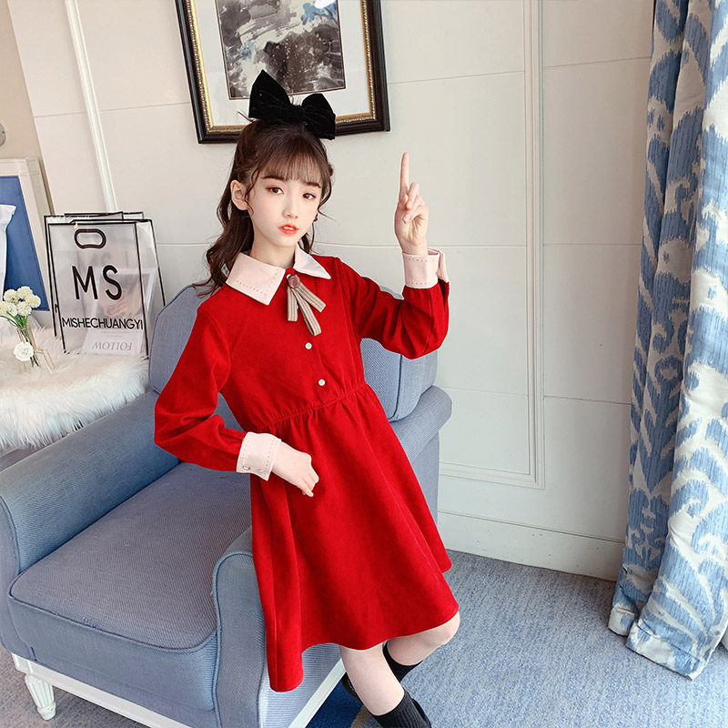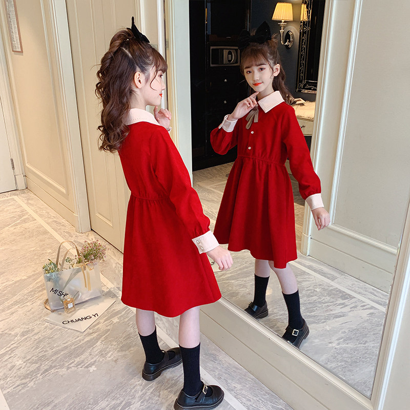 Girls Wear Long Sleeve Red Dress Long Skirt Over Knee 2022 Spring Clothing Children Girls Spring Autumn Skirt Dresses