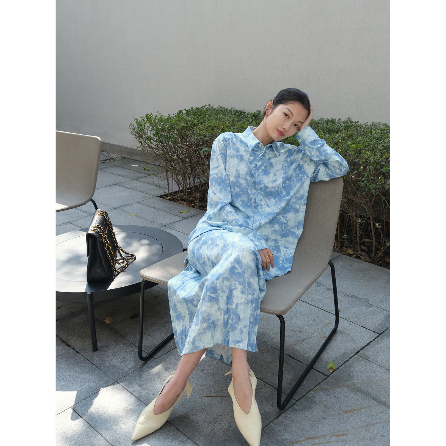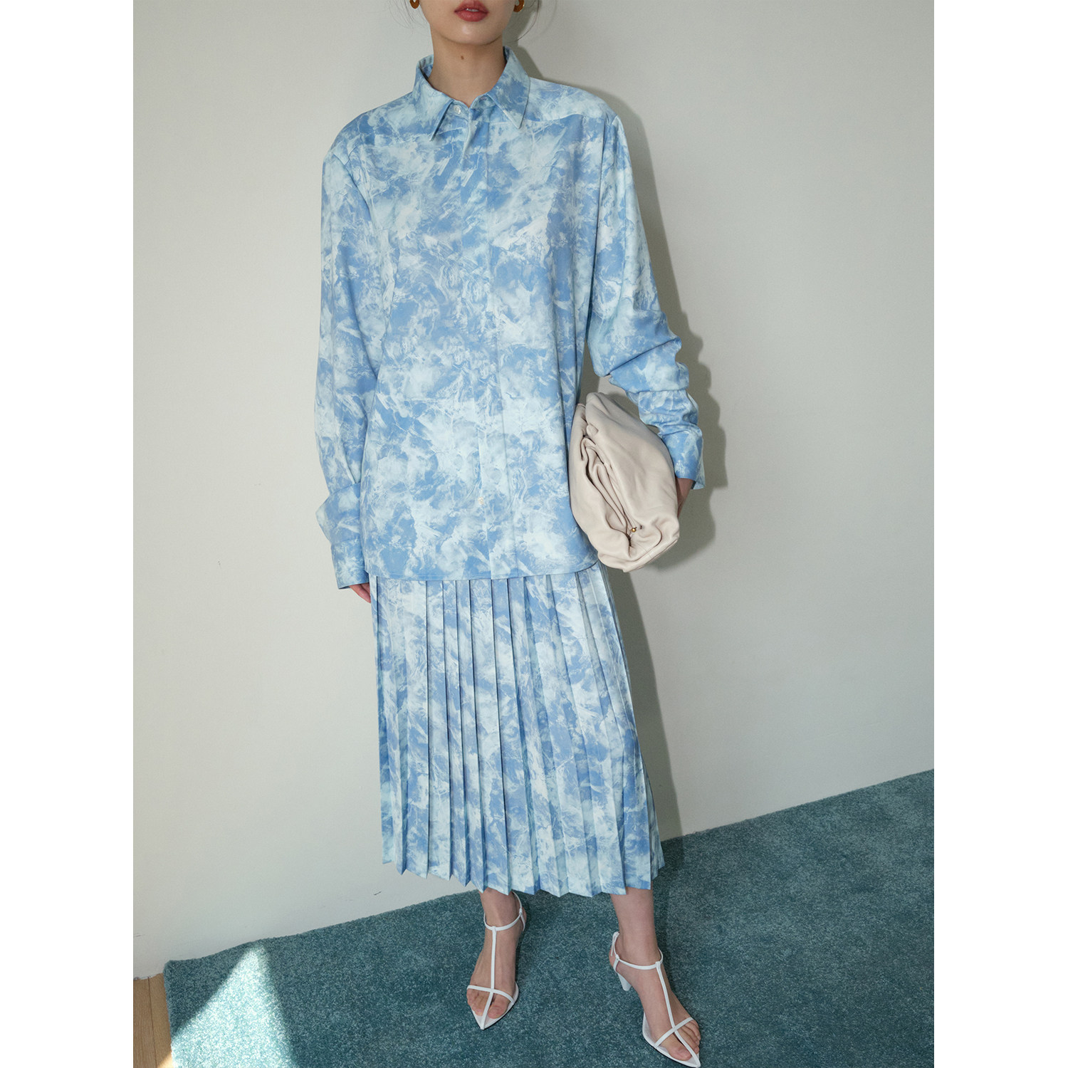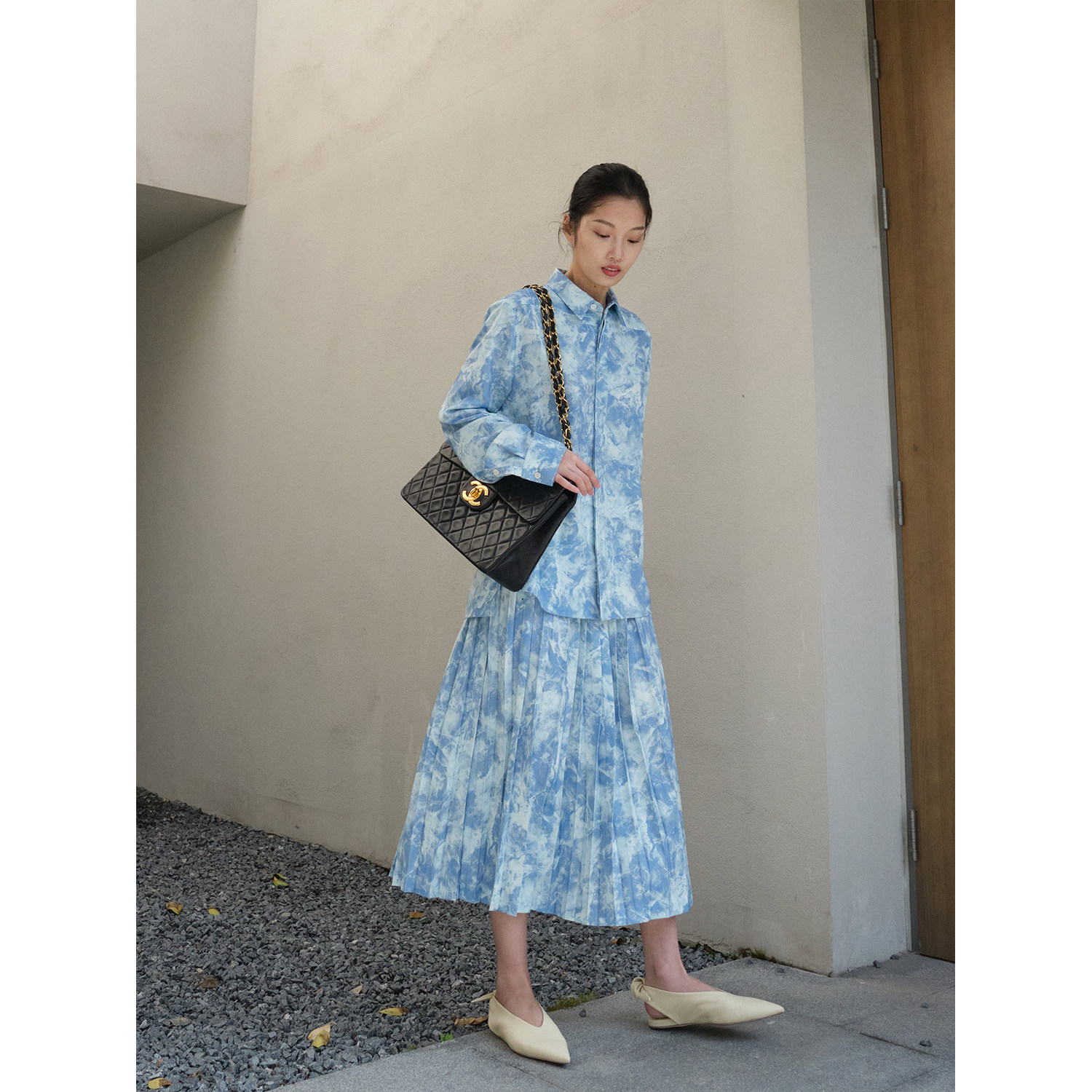 MRS Studios Exclusive UK Cooperative Blue Sky White Cloud Niche Design Printed Shirts 100 Pleats Half Dress
