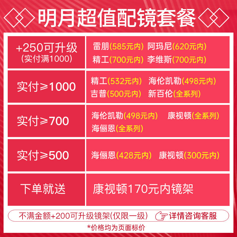 Bright Moon transparent lens aspheric (2 pieces) + send frame 1 pair Bright Moon anti-digital blue light (2 pieces) + send frame 1 pair Bright Moon PMC HD ultra bright (2 pieces) + send frame 1 pair Bright Moon outdoor discoloration (2 pieces) + send frame 1 pair Bright Moon transparent lens spherical (2 pieces) + send frame 1 pair Of Moon aspherical lens lens + Send Connvision price 249 yuan inner frame Bright Moon aspherical lens lens + Send Conshiton Price 300 Inner Hai Li En 428 Inner Mirror Frame Bright Moon Aspheric Lens + Helen Keller Price 498 Inner Frame New Balance Helen Hai Li En Full Series Mingyue aspherical lens + Seiko TS H0 AE or Levi's 458 yuan inner frame Bright Moon anti-blue light lens + send Conshiton price 249 yuan inner frame Mingyue anti-blue light lens + send Conshiton price 300 inner Hai Lien 428 inner frame Bright Moon anti-blue light lens + Helen Keller price 498 inner frame New Balance Helen Hai Li En full series Bright Moon anti-blue light lens + Seiko TS H0 AE or Levis 458 yuan inner frame