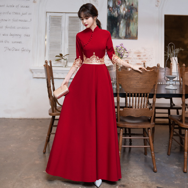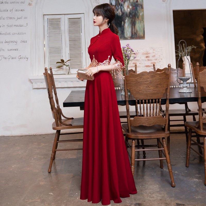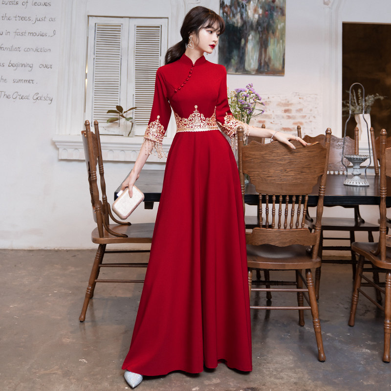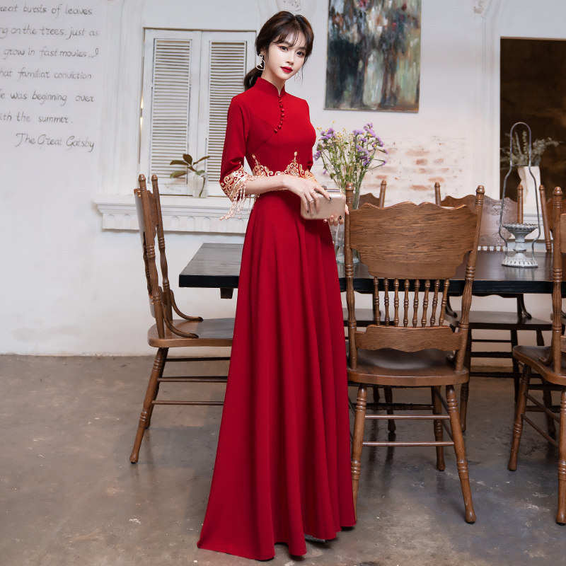 Toast Bridal Qipao 2022 New Summer Wine Red Long Sleeve Long Version Wedding Chinese Gown Lady Summer Back Door
