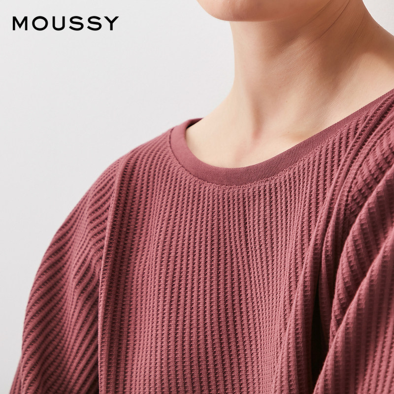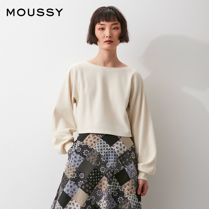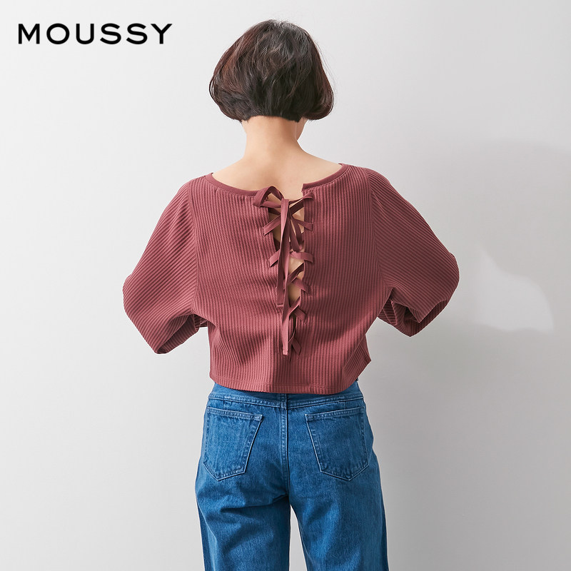 MOUSSY 2021 new spring and autumn round neck lantern sleeve back strap knitted T-shirt 010ES780-0170