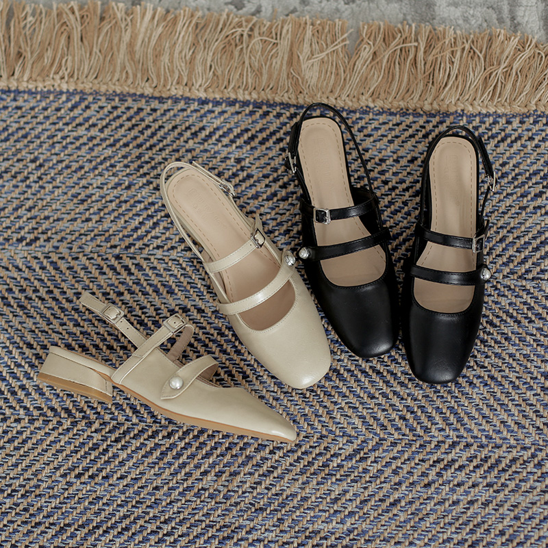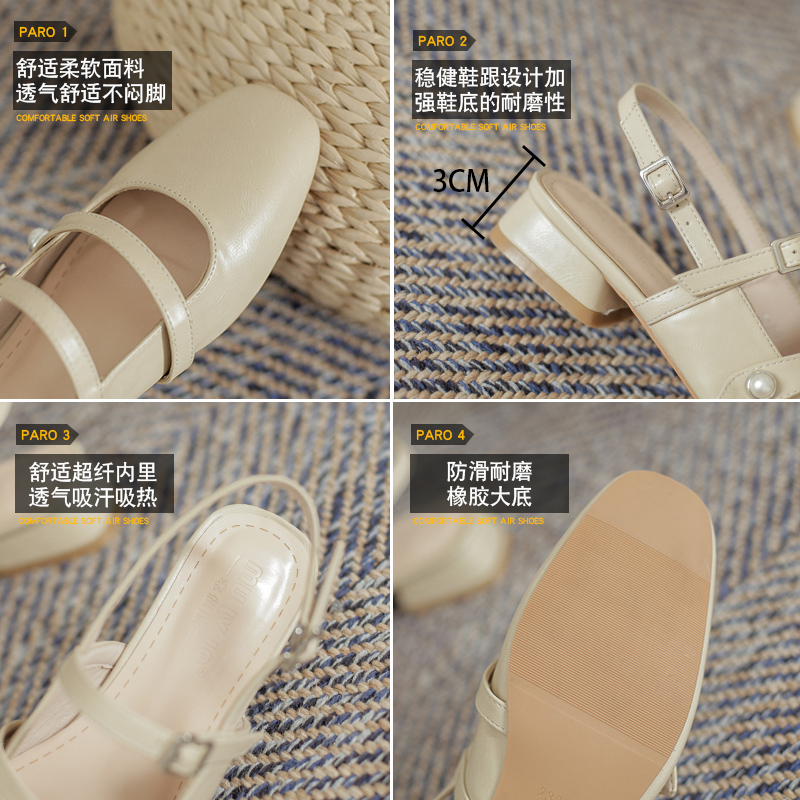 Small size women's shoes thick heel square toe fairy style pearl toe shoes 2021 new low heel one word buckle back empty sandals summer