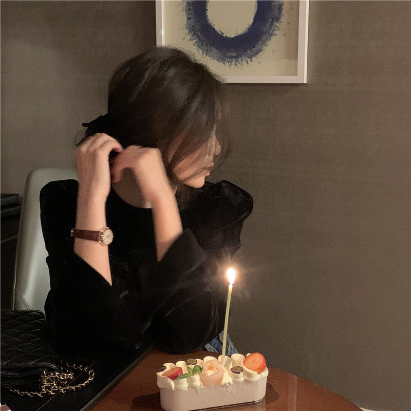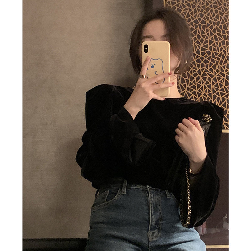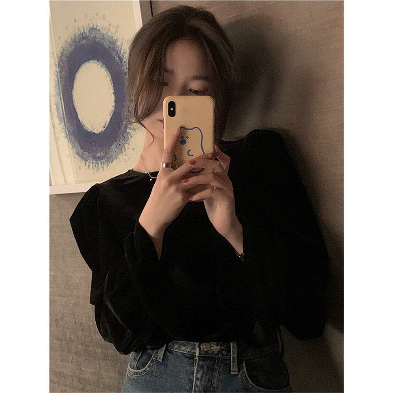 2022 Spring Summer Dress New Law Style Retro Design Sensation Bubble Sleeves Shoulder Black Velvet Long Sleeve Blouse Minus 100 lap