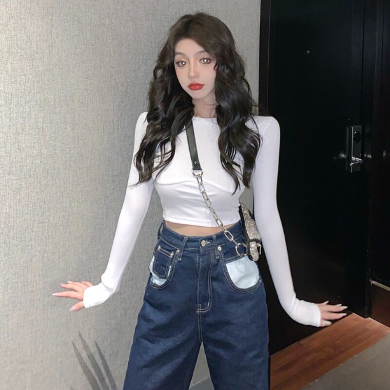 Vanya white knitting jersey and spring-autumn Han edition of short duty luff long sleeve T-shirt tide