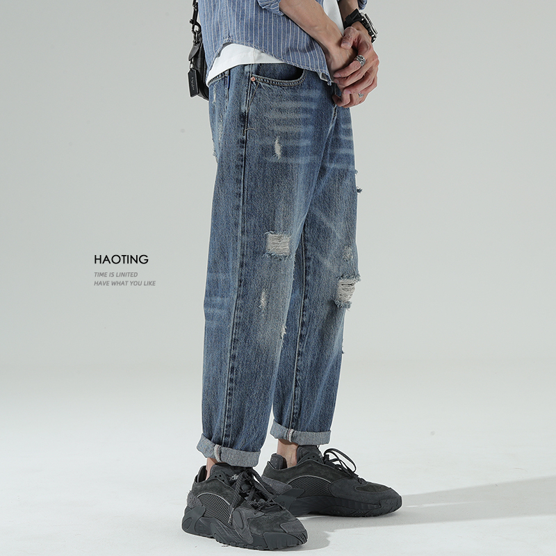 Heng " Spring hole jeans men loose straight tube nine pants dress casual and tide - plate beggar pants