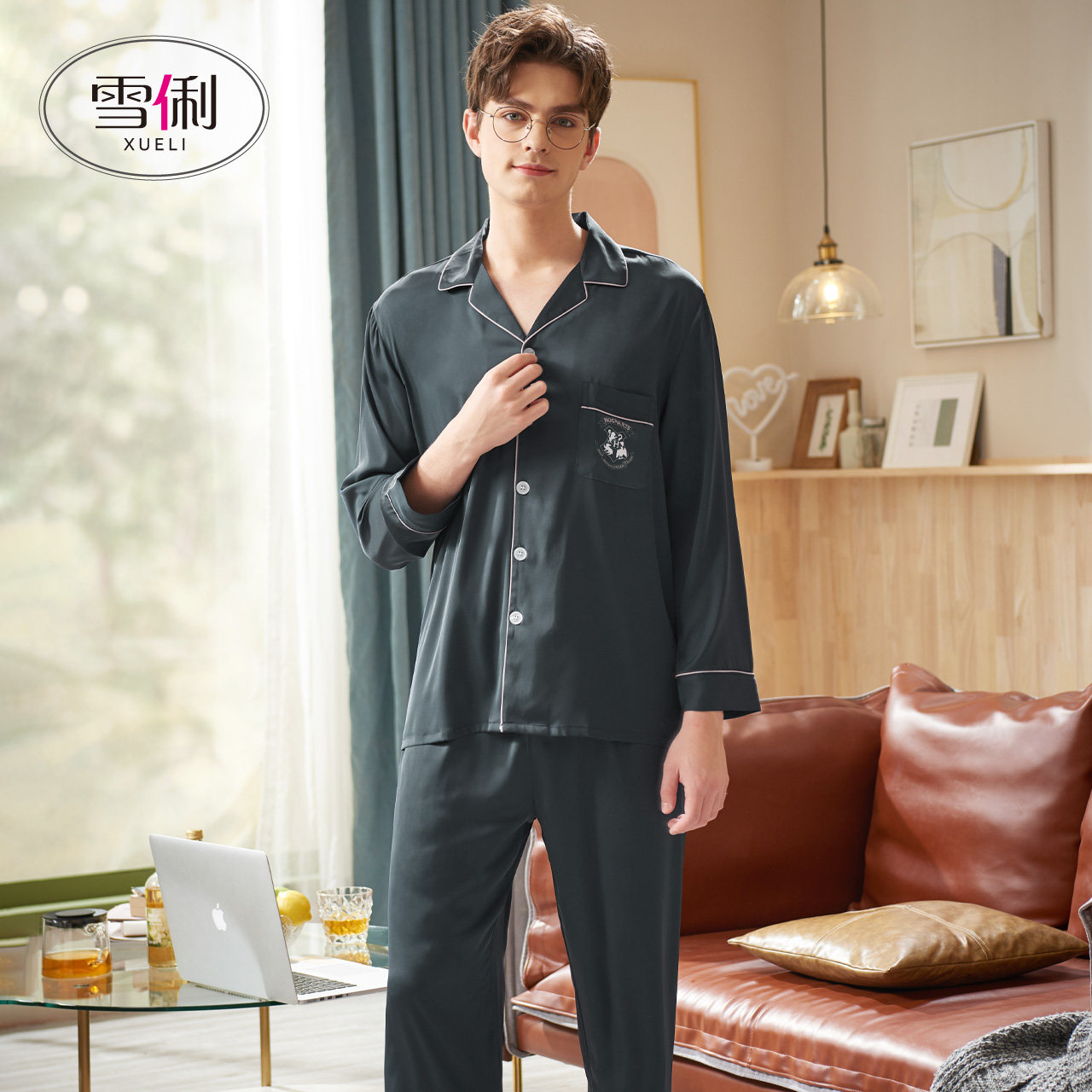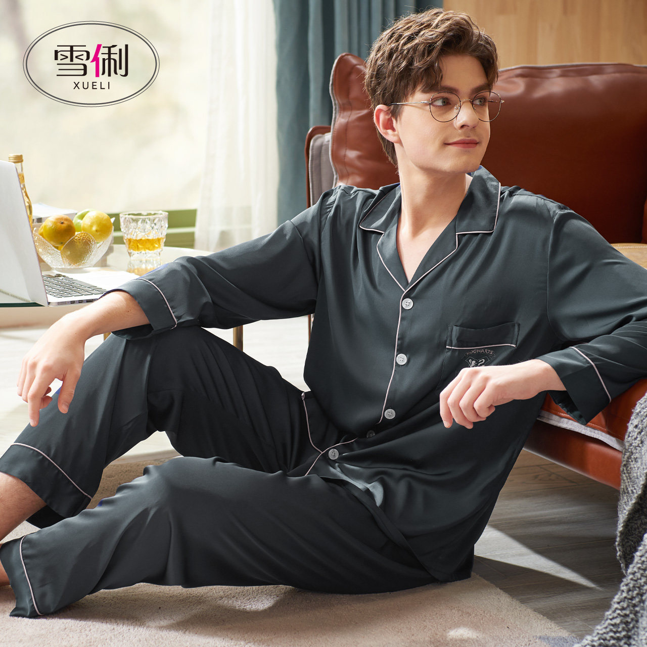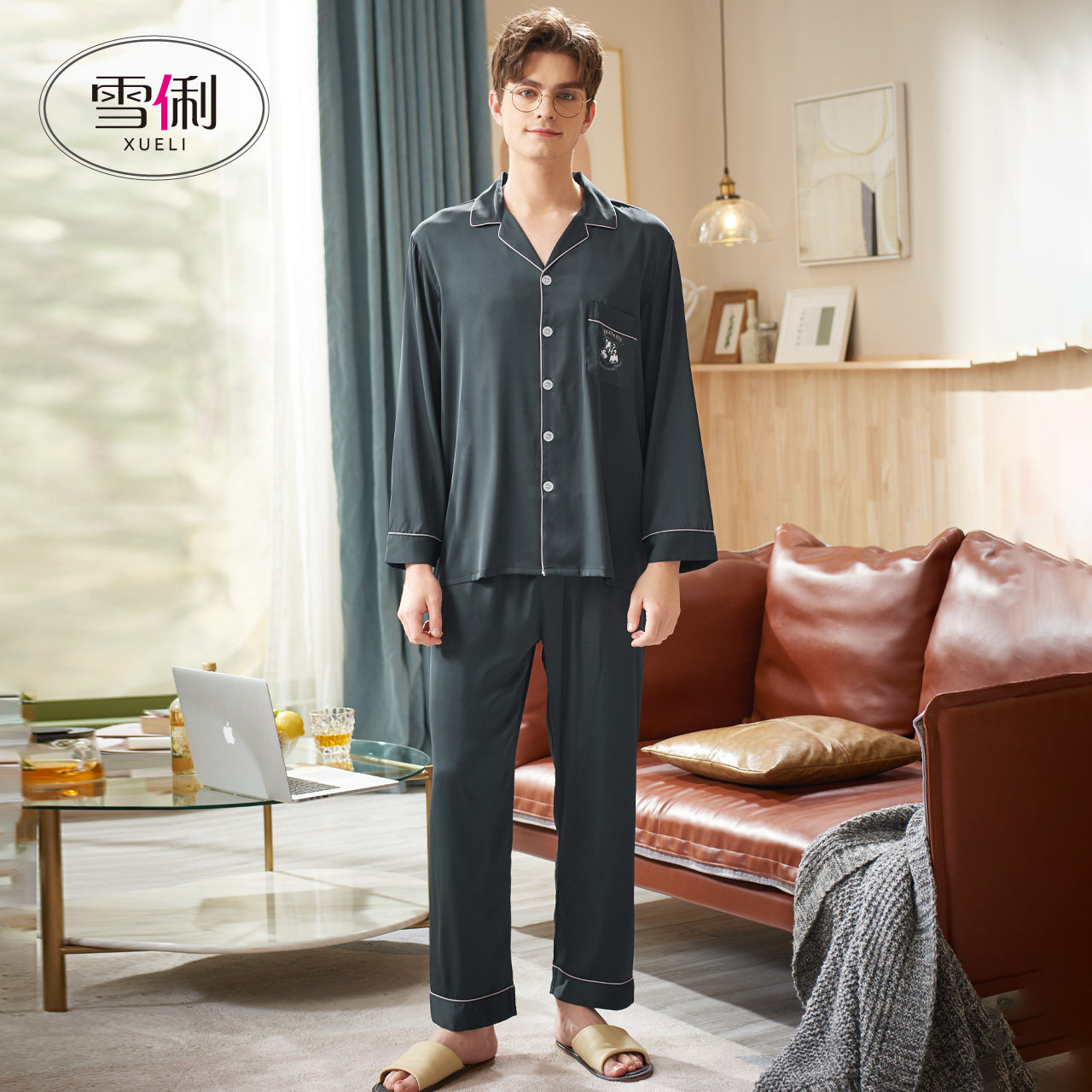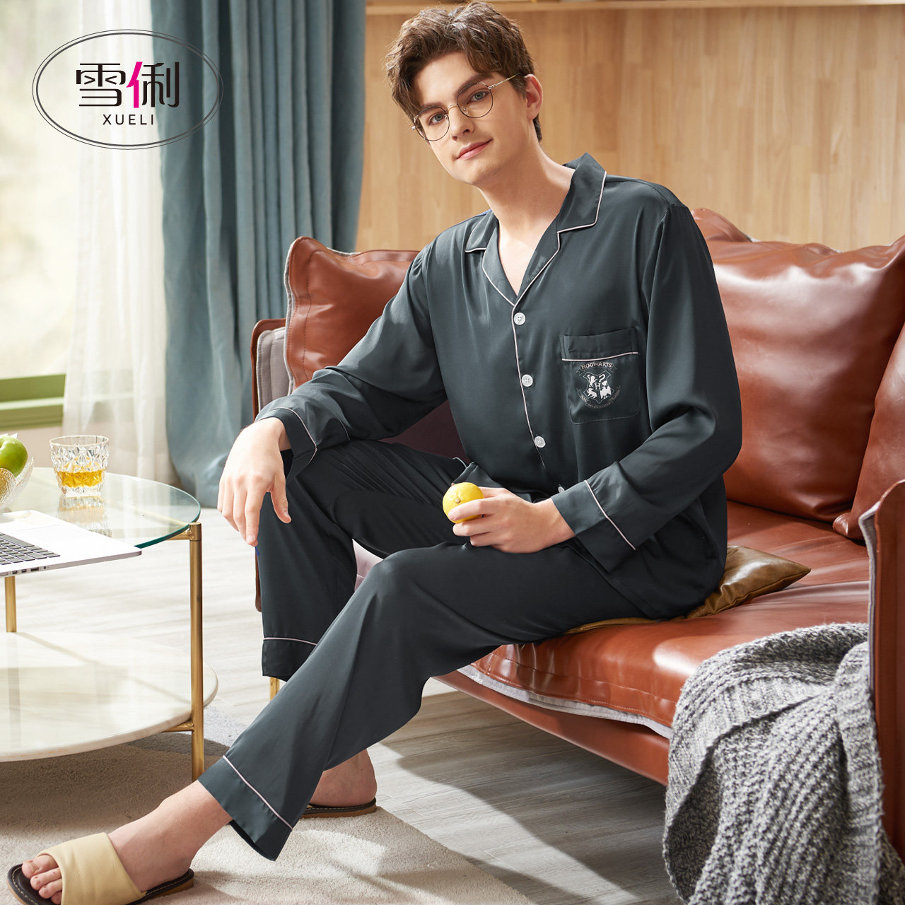 Snow Li pajamas men spring summer long sleeve ice silk home wear summer thin dad imitation silk house wear set