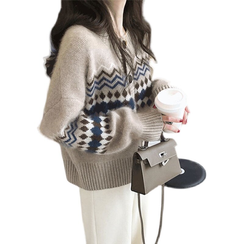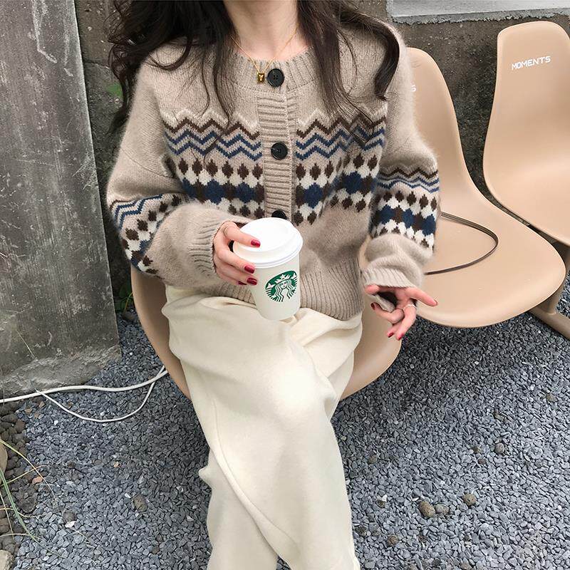 French maje 21 new lazy style diamond knitted cardigan jacket retro loose round neck sweater women
