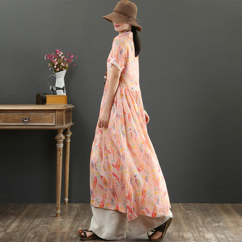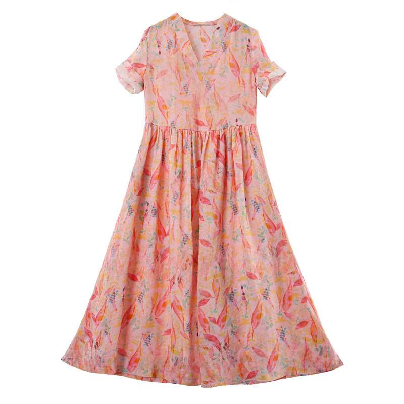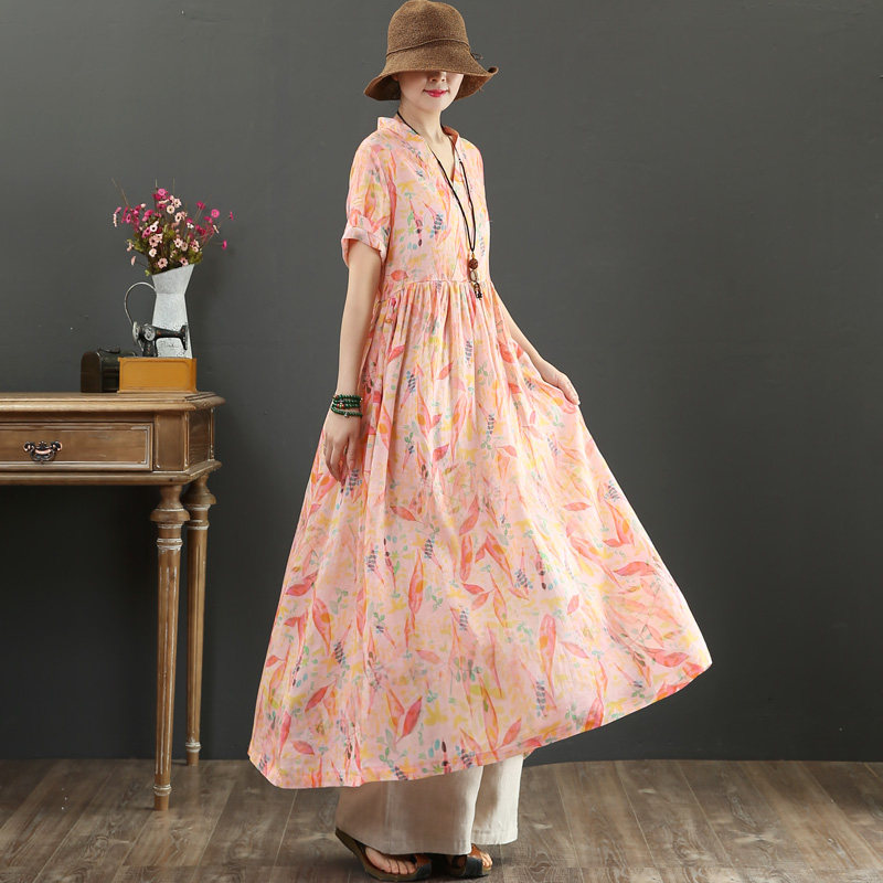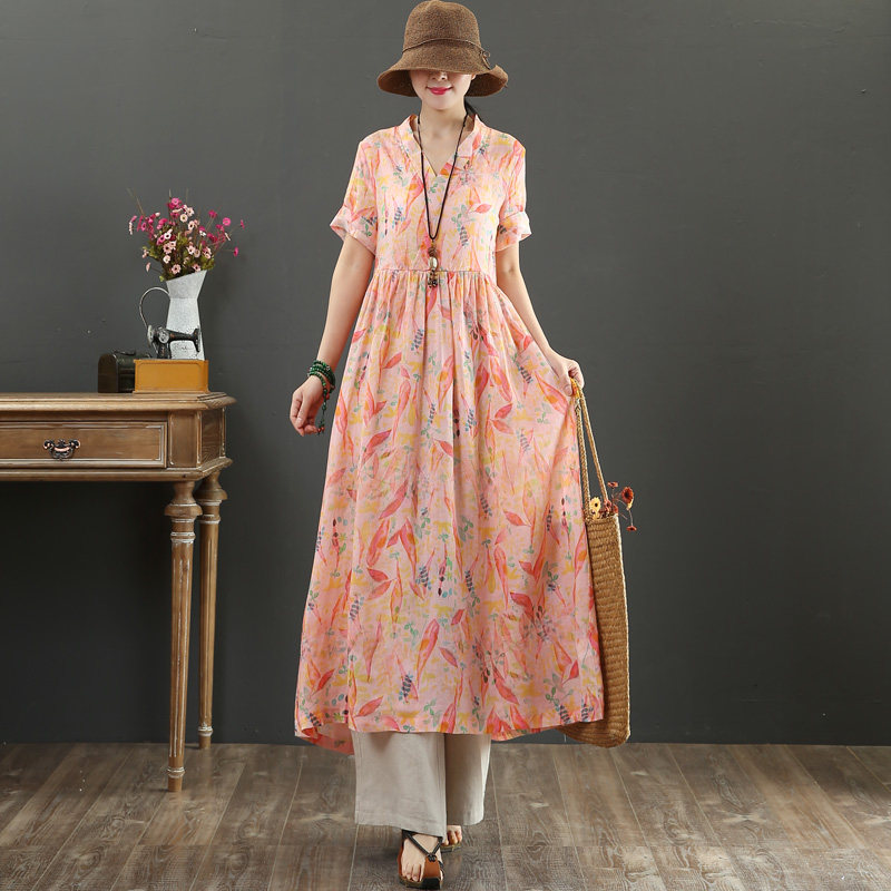 September Kaka original pure hemp print V-neck long dress literary large size short-sleeved large swing long version of the dress 2160