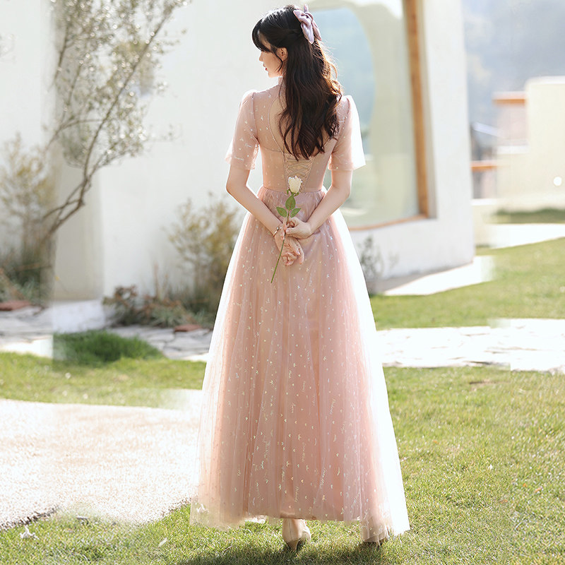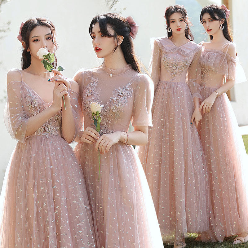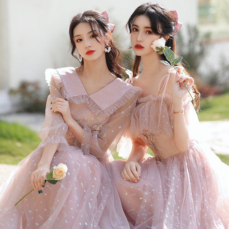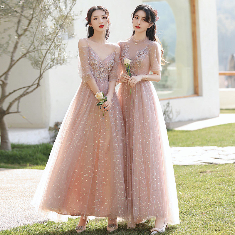 Bridesmaid's Fairy Temperament 2022 New Winter Pink Wedding Sister Group Evening Gown Dress Girl Long Version of Lean Spring Autumn
