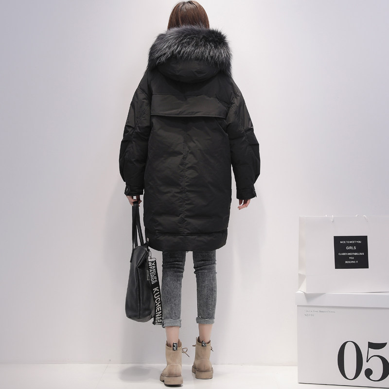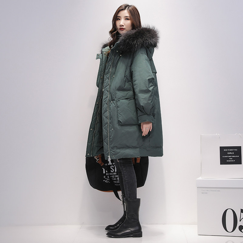 Down jacket women's winter medium long style 2021 new fashion foreign white duck down women's real fur collar loose thick jacket