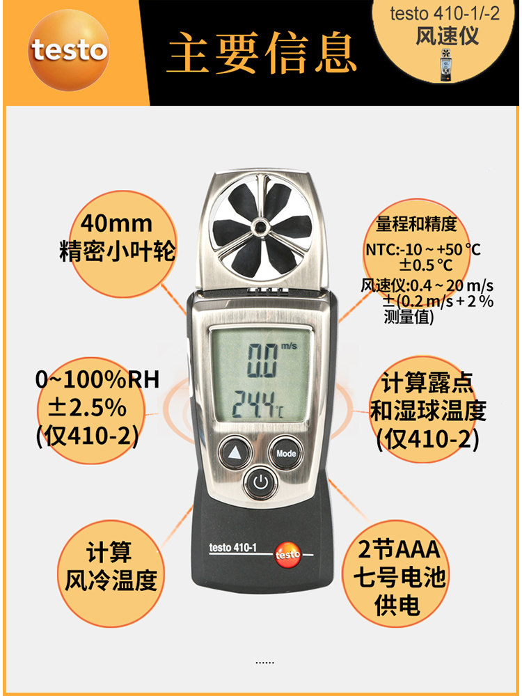 Testo testo410-1-2 anemometer impeller wind meter industrial hand-held i high precision air temperature Germany