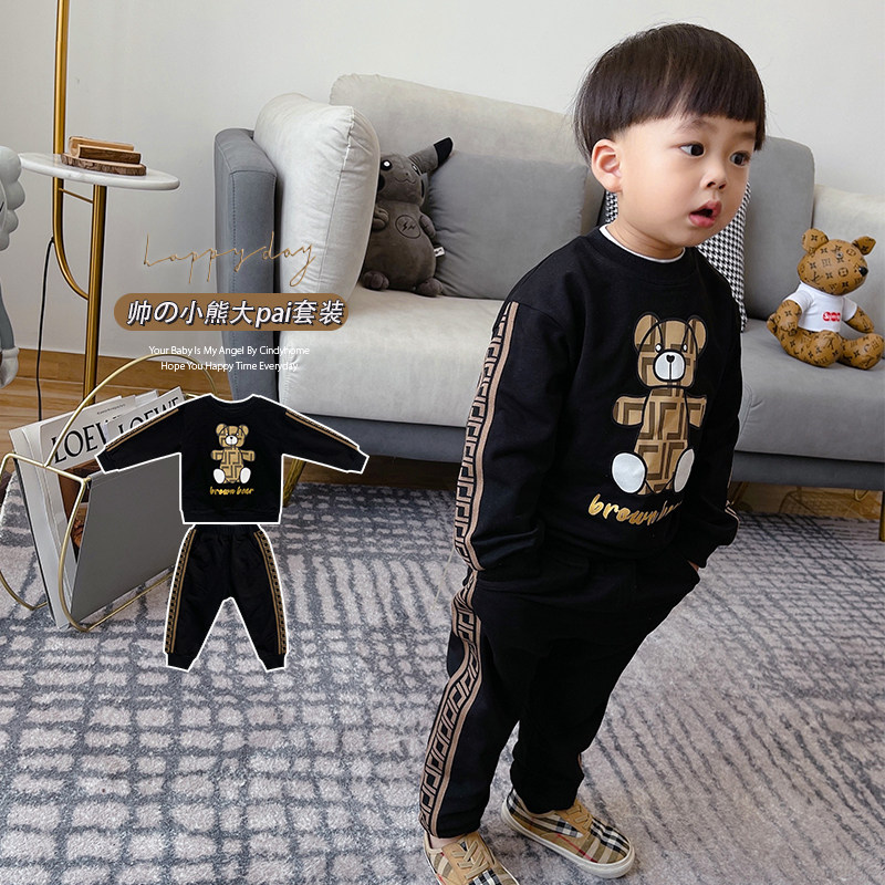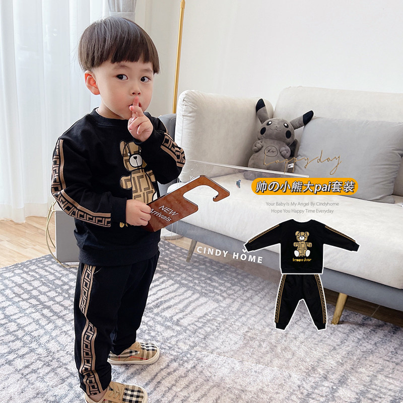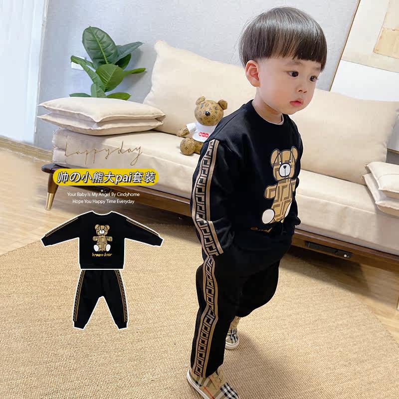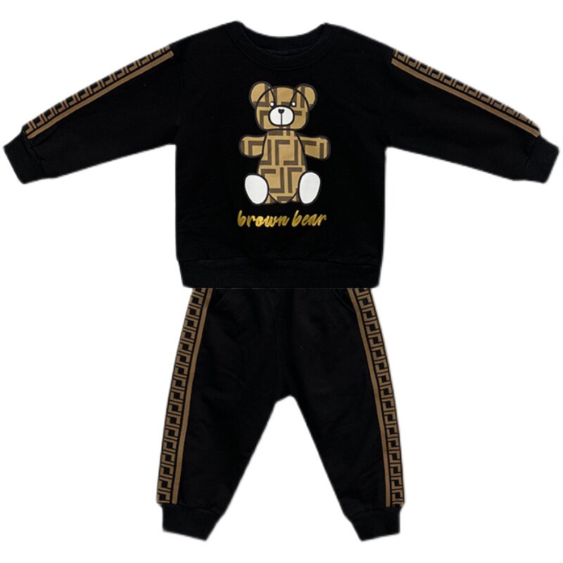 Cartoon cute printed bear children's spring and autumn clothes baby cotton long-sleeved thin black children's suit
