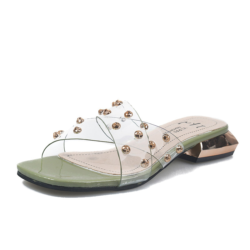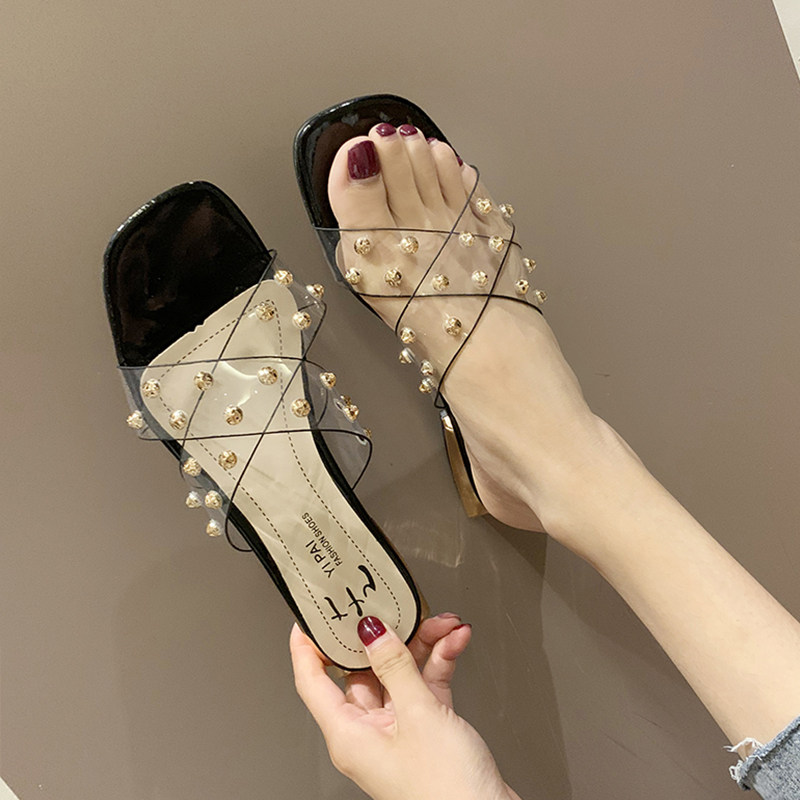 Slippers female outwear coarse heel low heel-lined with stylish cross cool drag 2021 new transparent rivet beach shoe