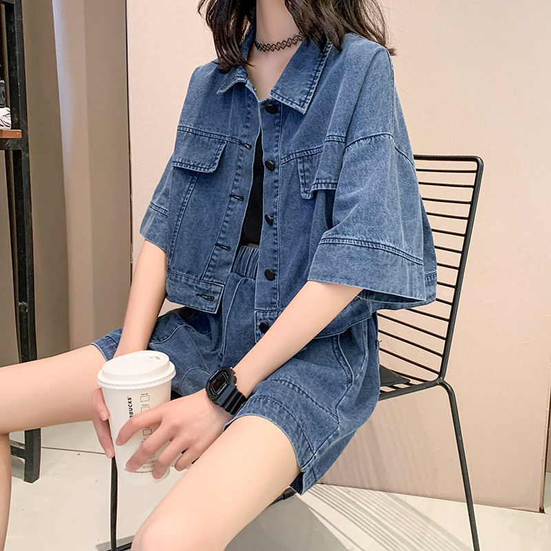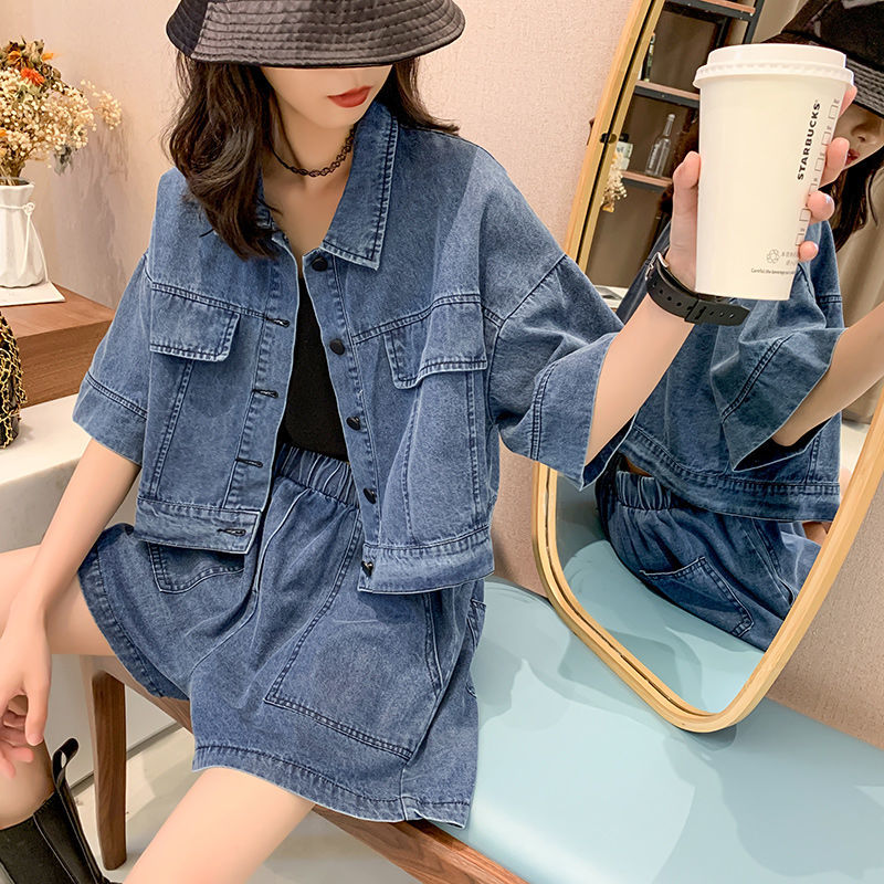 Large size women's fat sister spring and summer new fashion foreign pie belly thin denim shorts set women's two-piece set