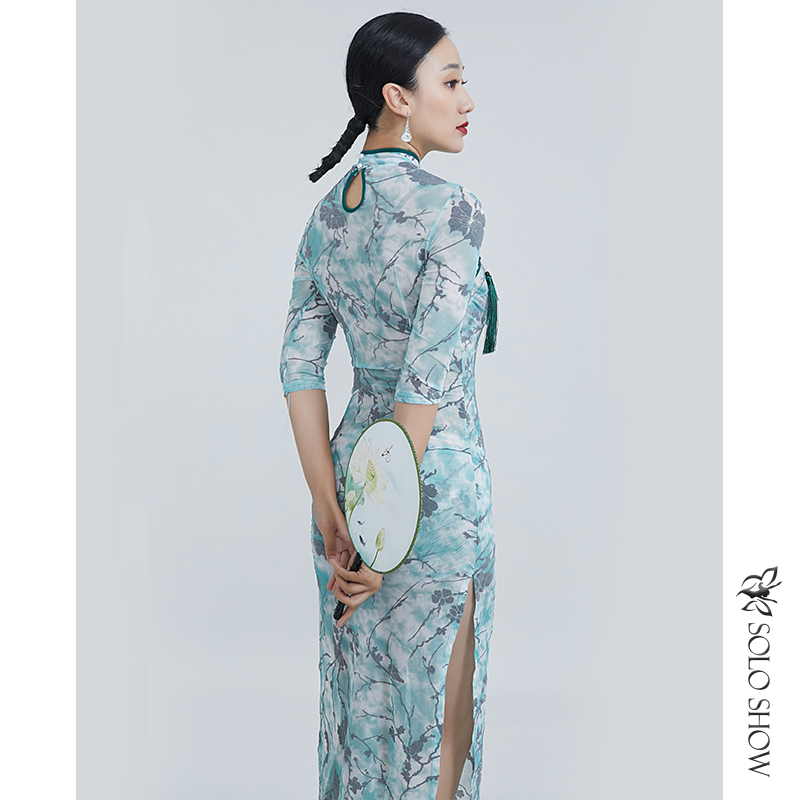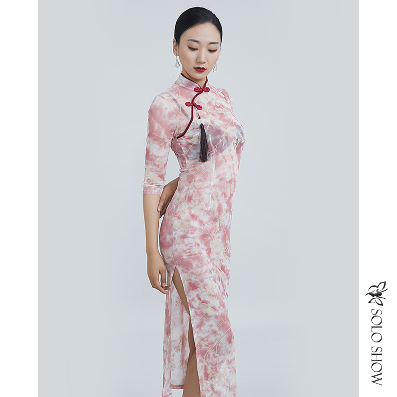 Gorgeous unique show improved cheongsam 2022 new female spring temperament flocking yarn cheongsam long version of classical belly dance clothes