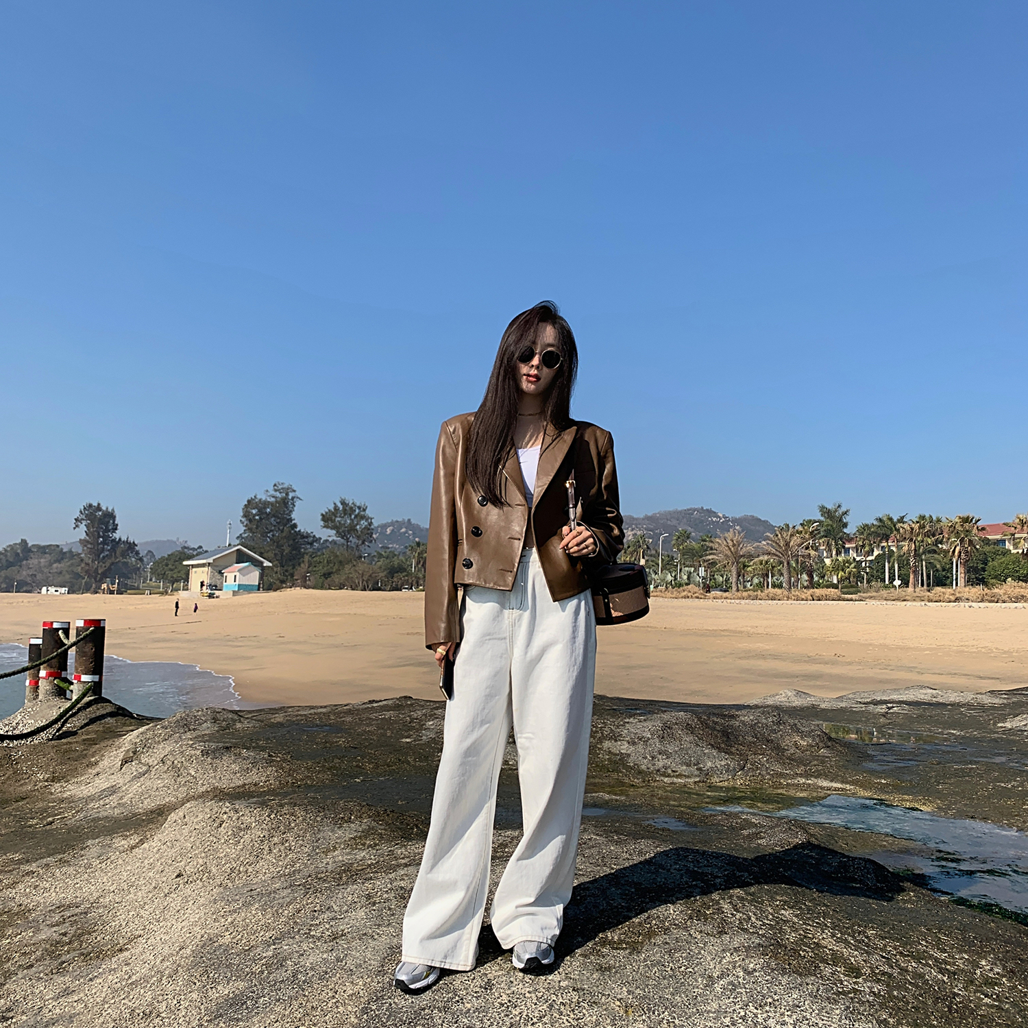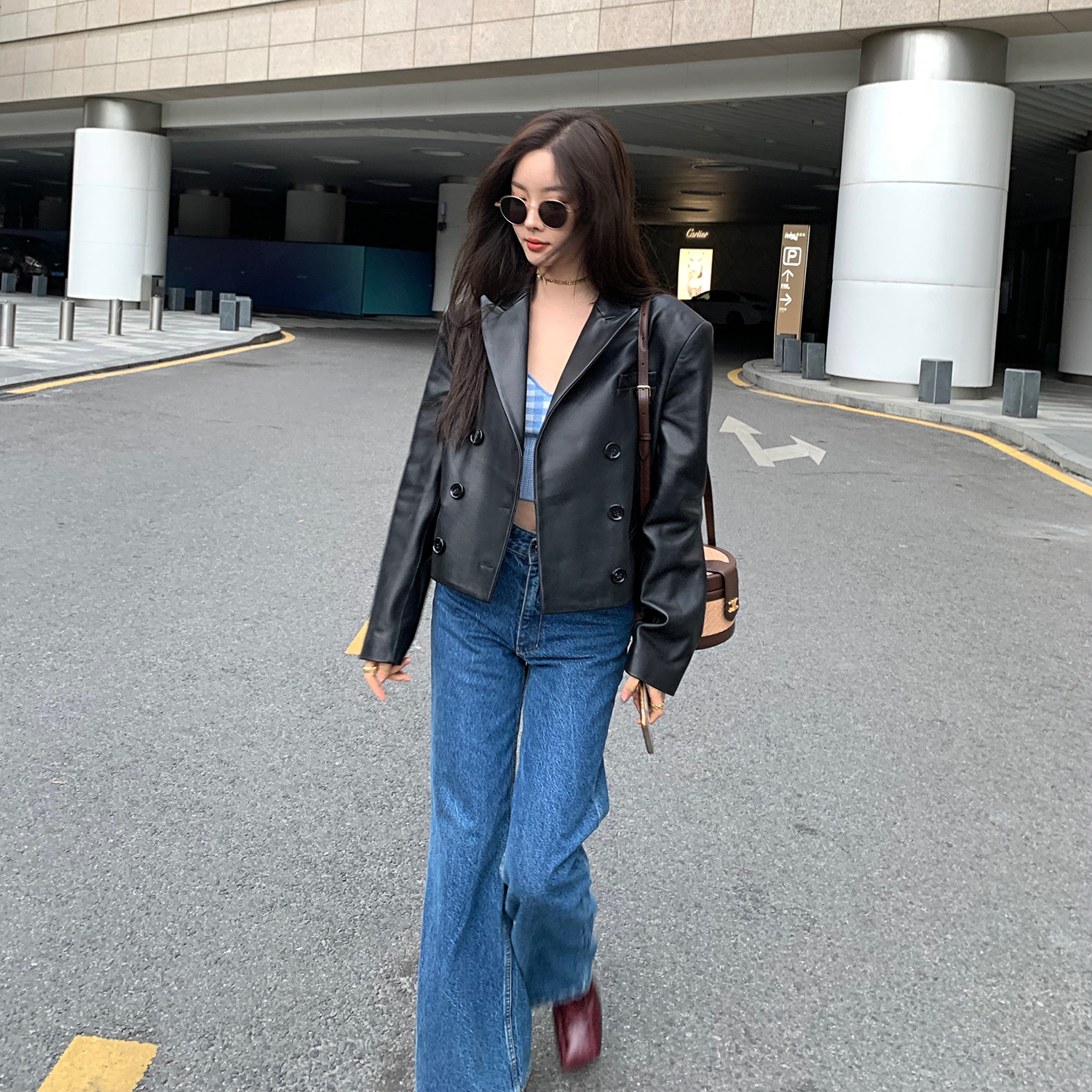 Fu Zhi'en cool out of the street Leather leather jacket double-breasted vintage blazer sheepskin jacket women 2022 new model