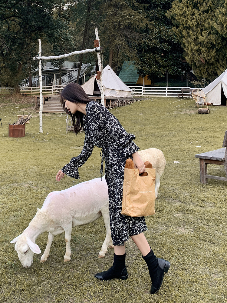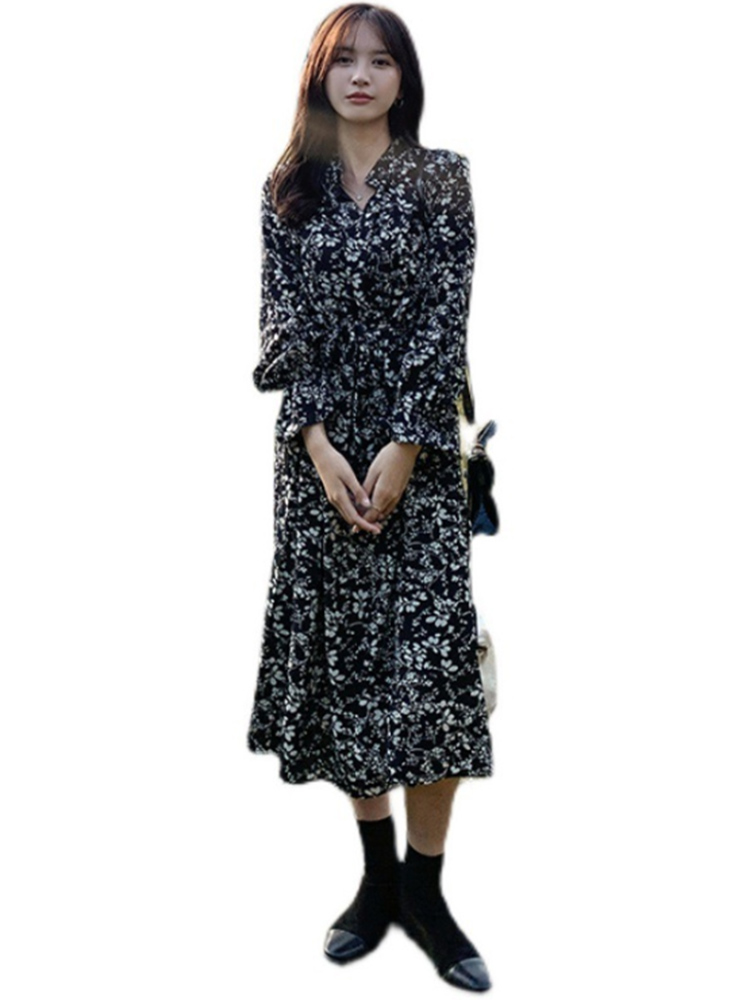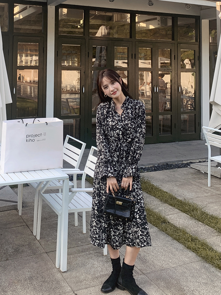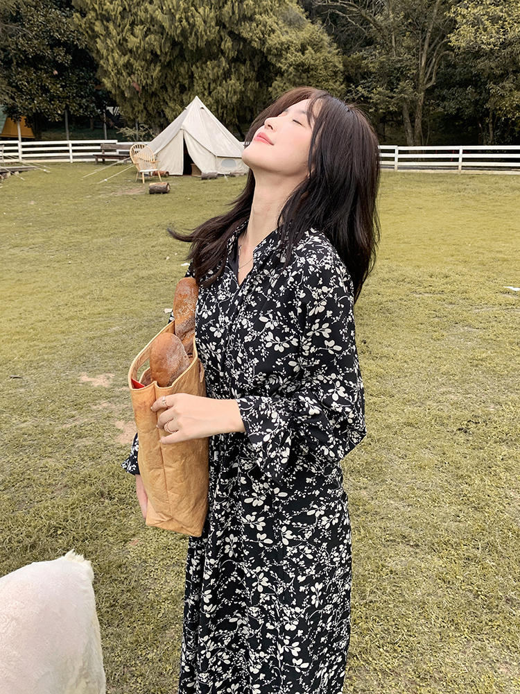 Lecea Alice Black Crushed Flowers Ocean Dress 2022 Spring new French style retro waist temperament Long dress