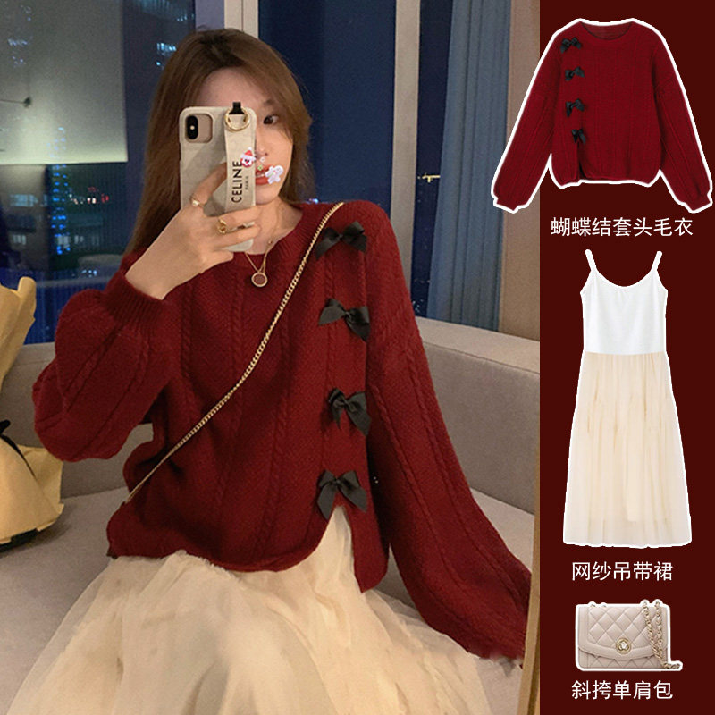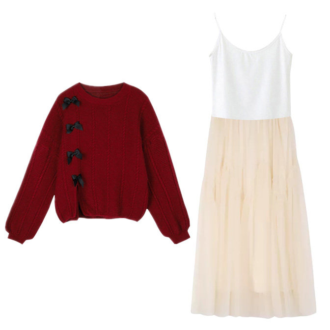 Red sweater apricots color hanging band dress suit white sweater black pendant with red sweater single piece white sweater single piece apricot color hanging band dress black hanging strap