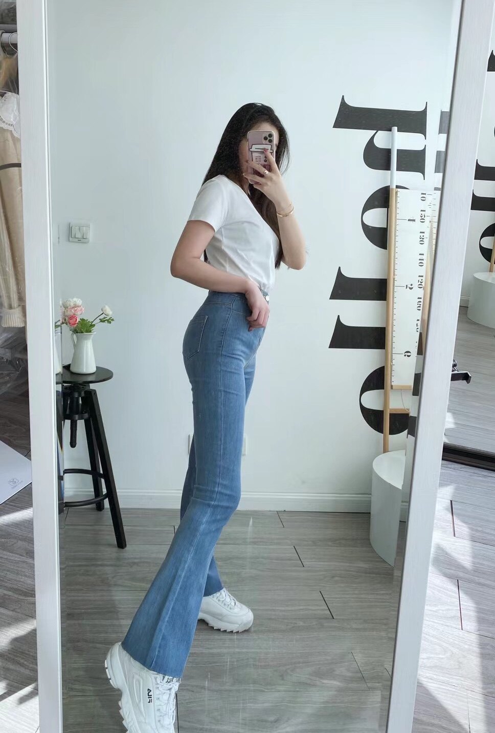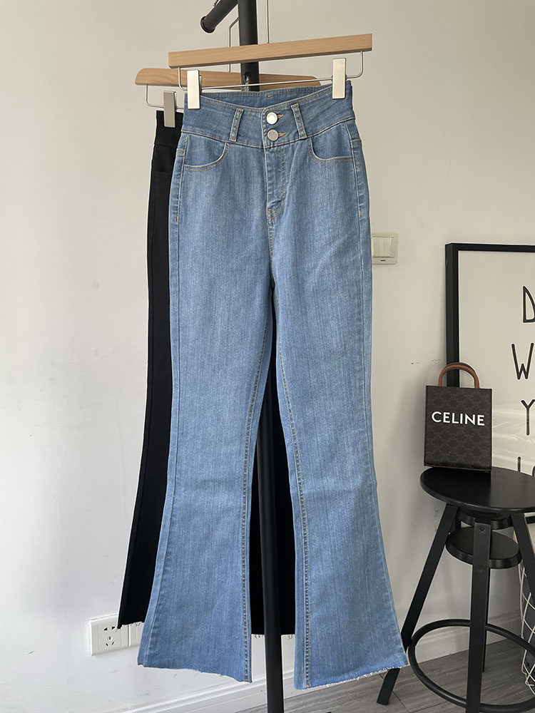 Second leg fine ju shows long legs European version double button high elastic tight flared trousers cut edge blue jeans women