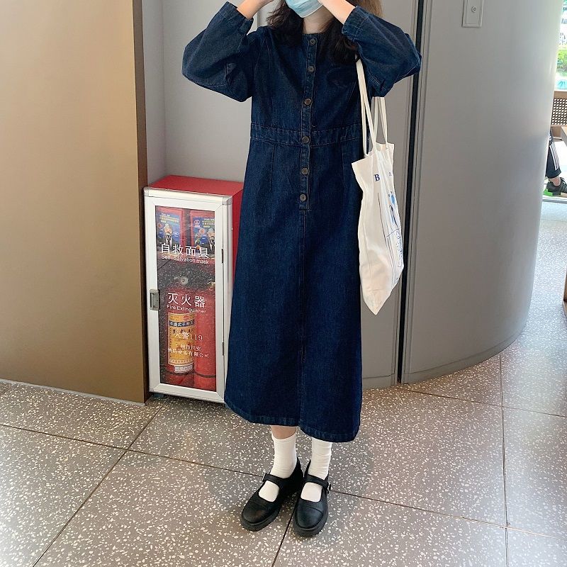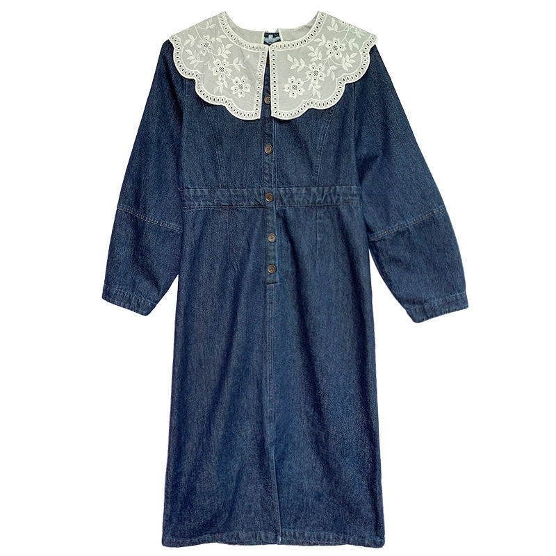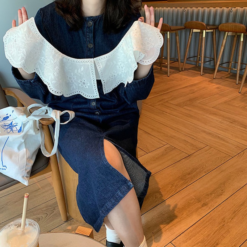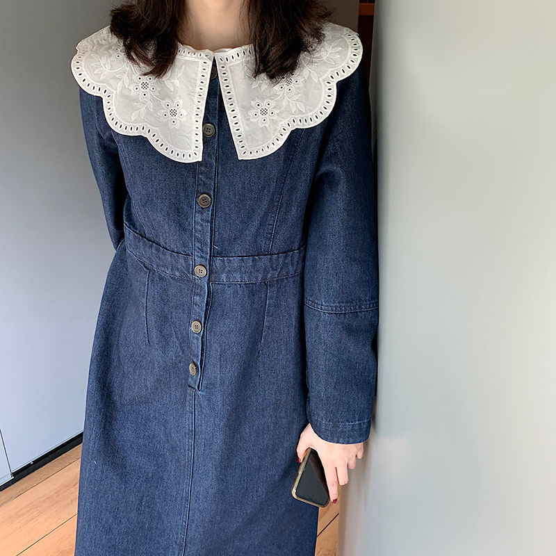 The Korean version of the Lean Straight Drum Retro Korean version Temperament Cowboy Dress Mid 2021 Spring new Doll Collar Tide