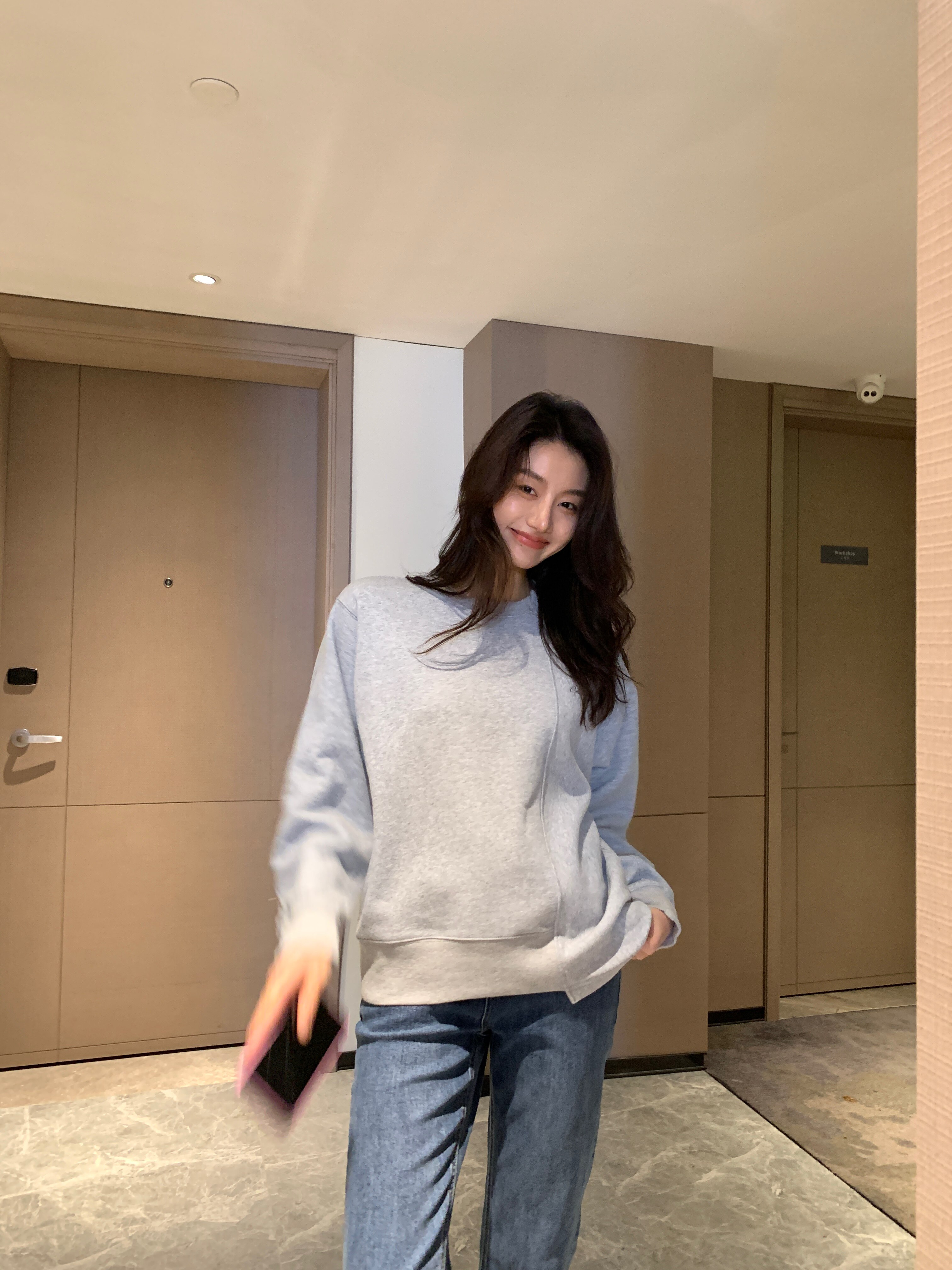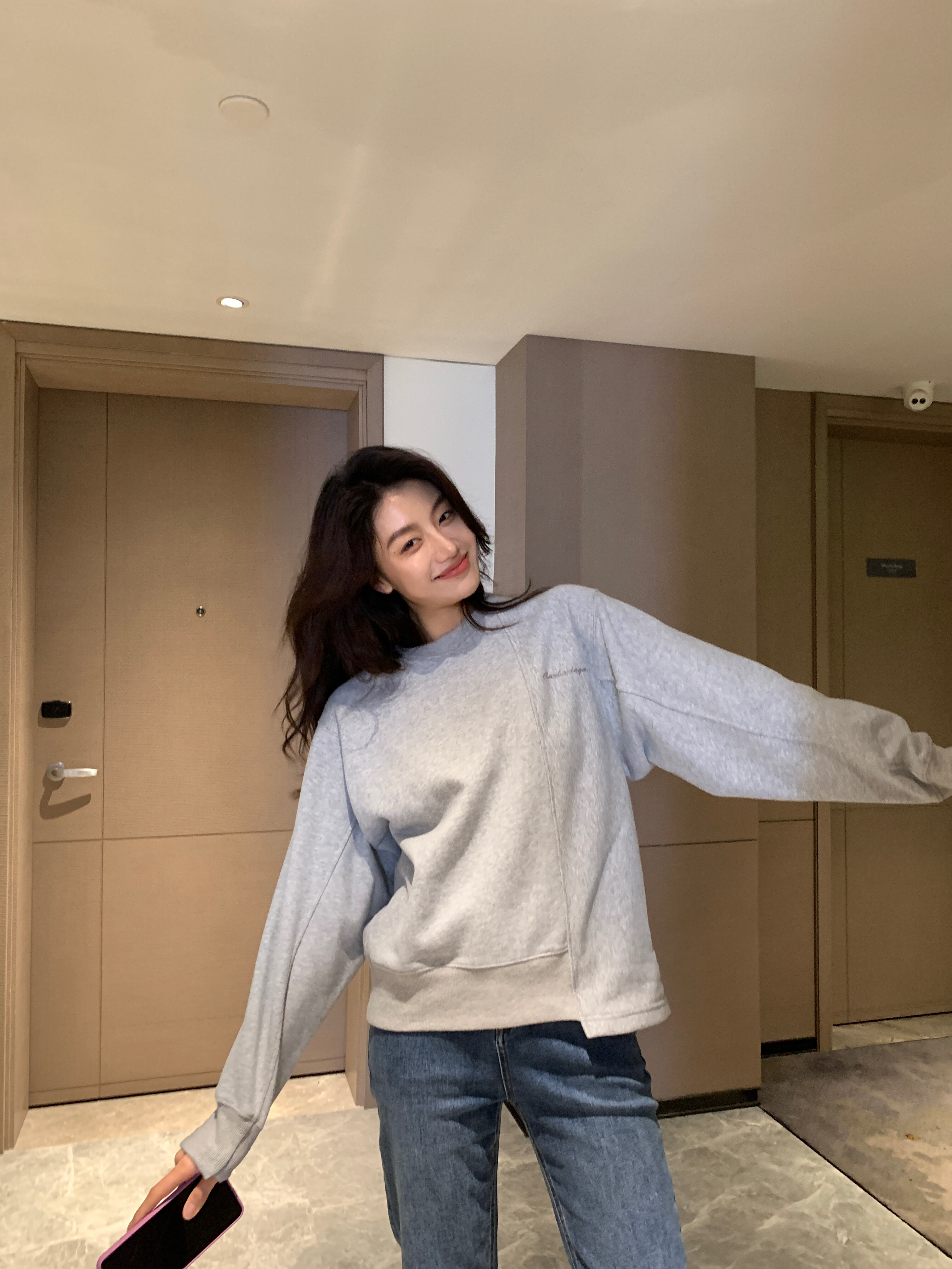 Garbociaga Long Xi'er lazy style design plus velvet loose round neck splicing sweater female E067