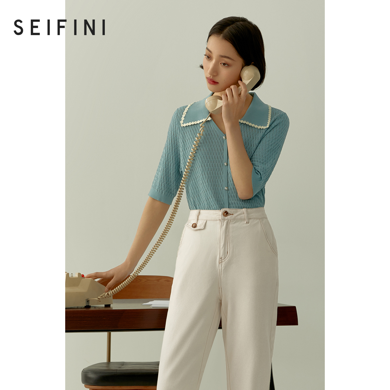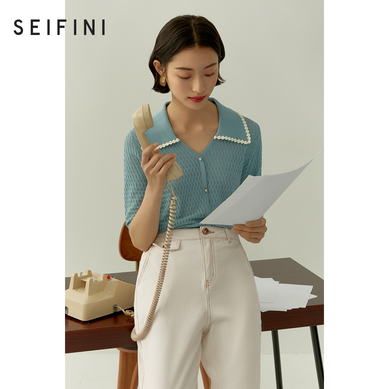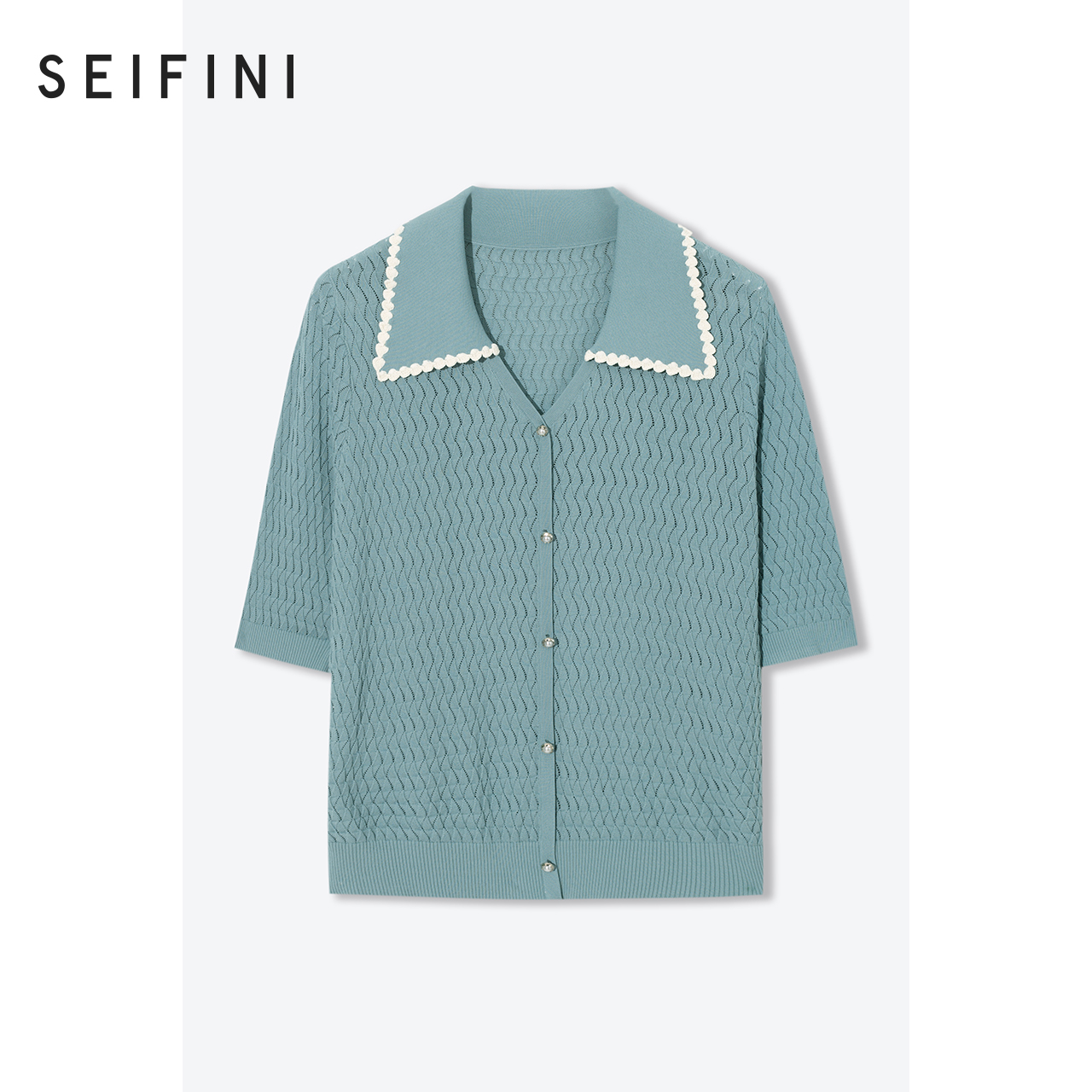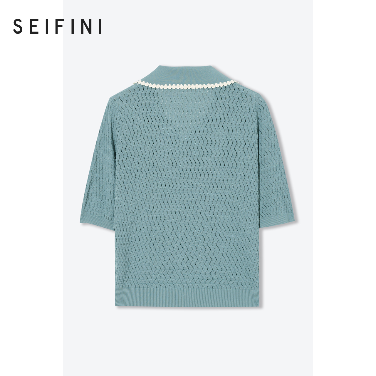 Mall Same-style Poetry Fan Weaselnitwear 2022 New spring sea blue cover Temperament Short Sleeve Knit