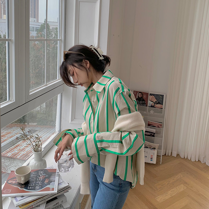 NORA green striped shirt female design sense niche early spring fashion loose retro port flavor shirt top tide
