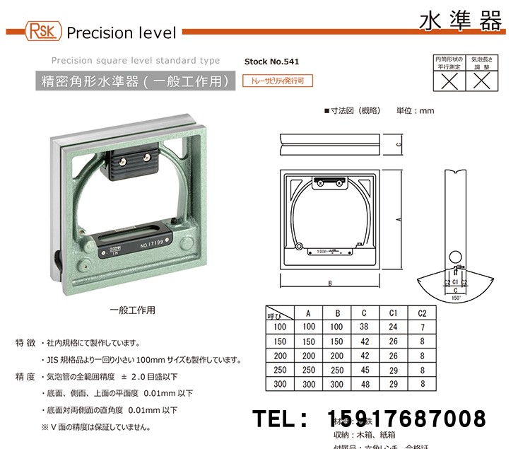 Japan RSK New Laxative Research Precision Square Gradienter 541-1505 150X0 05 square horizontal ruler