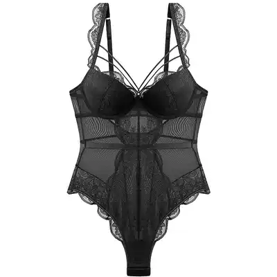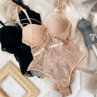 European and American girls underwear gathered thick bra sexy lace transparent suspender jumpsuit hollow beautiful back red